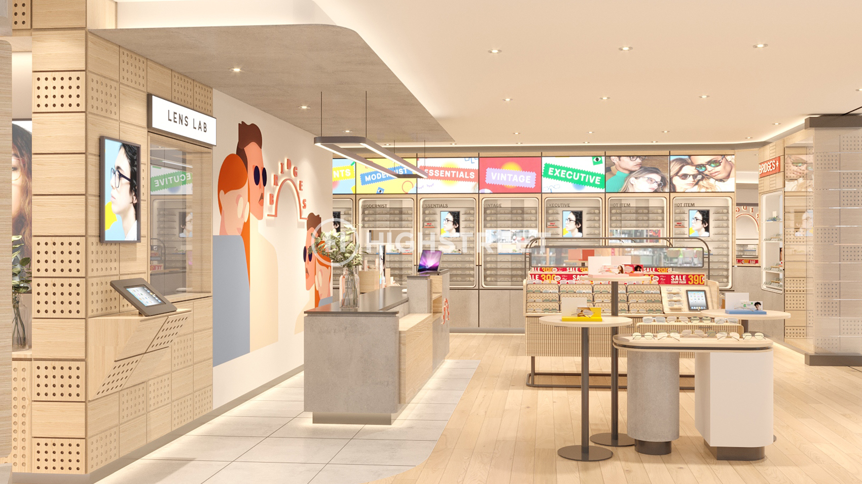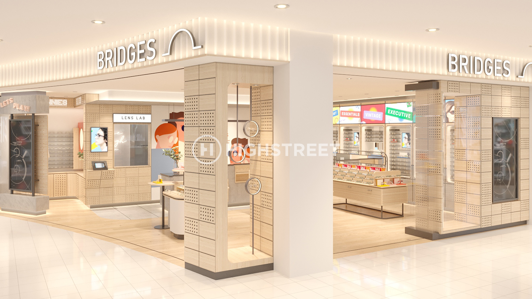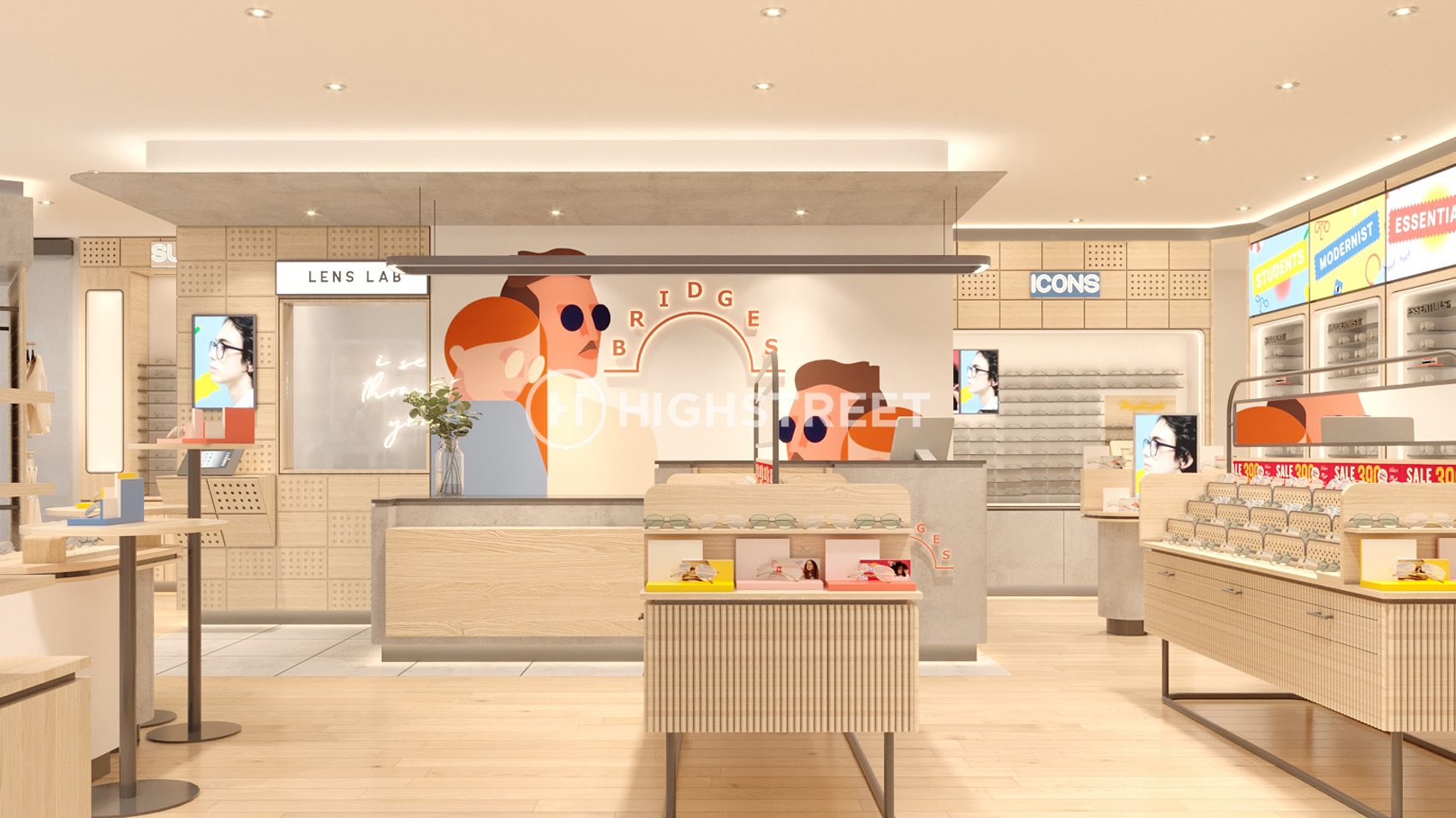 We designed Bridges Eyewear with a casual concept for the interior. Not only that, to present a simple and monochrome interior design, we chose to use natural and pop colours that are well combined with bright lighting.