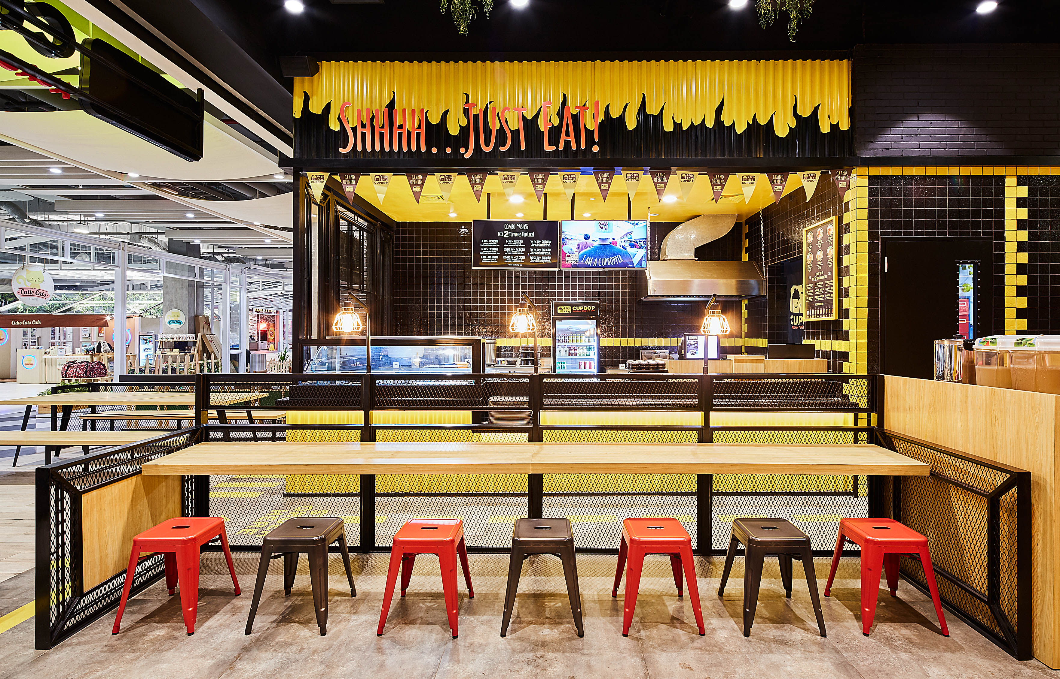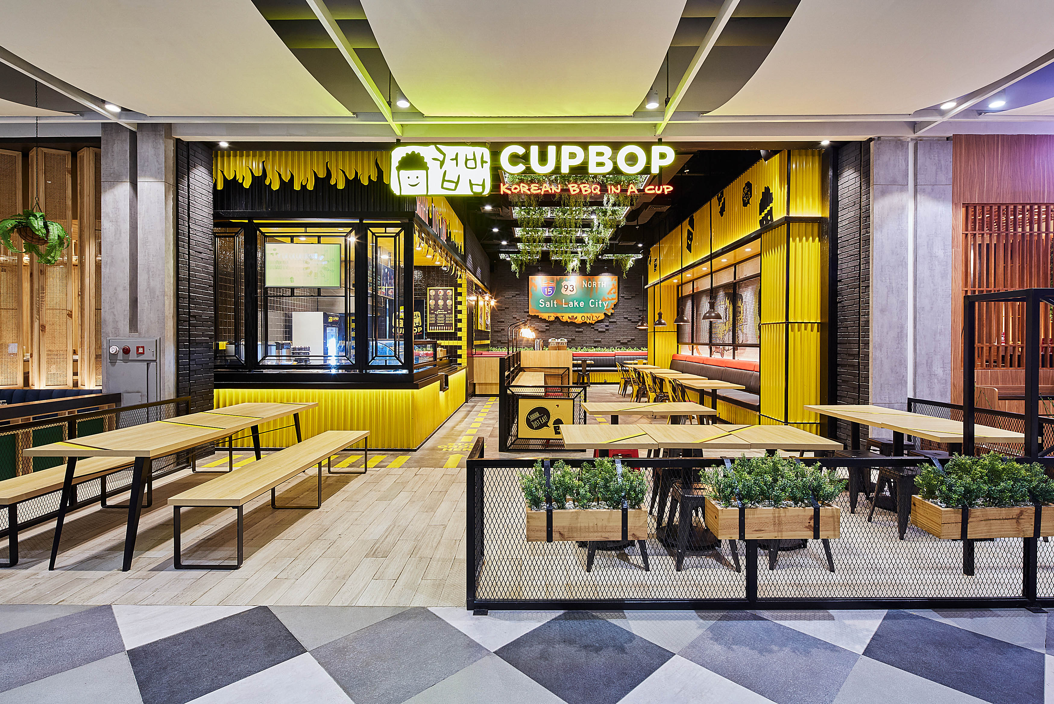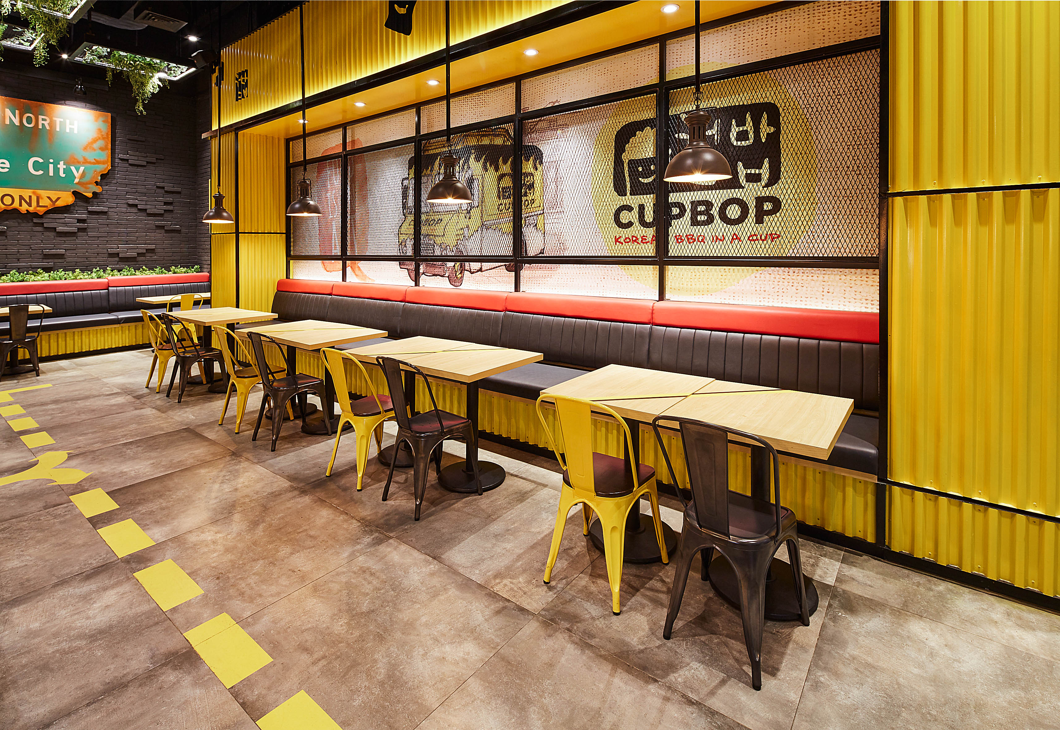 High Street is trusted to develop their flagship outlet at Living World, Alam Sutera, Tangerang. InteriorDesign inspired by their start on the foodtruck scene with corrugated panels and bright yellow colors, so the ambiance we create is street like interior style with using a lot industrial material into it like black painted steel, brick wall, and cement pattern tile. For this restaurant design we also focused on making a good circulation and put signage to facilitate a customers because this restaurant has self service system which requires visitors to order and bring their own food to the seat.