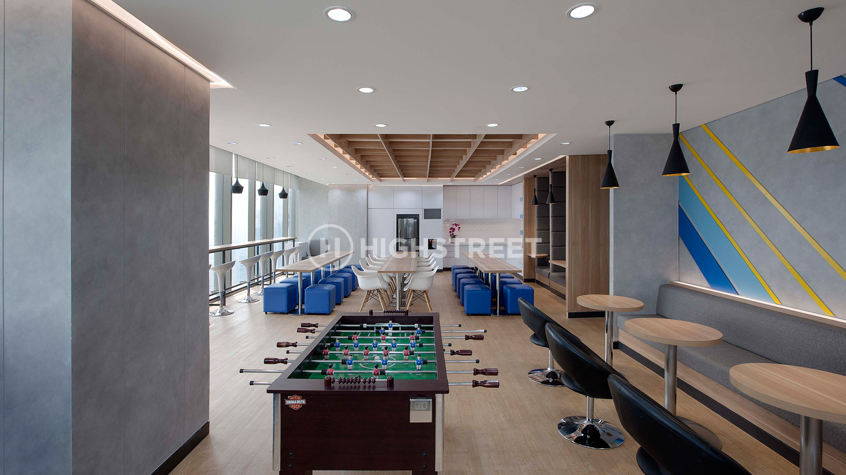 Starting from the lobby area that is spacious and looking very representative with the live plants that filled some areas of the wall. While for the main work area was open-plan designed, without any space partitions, making workers more connected to one another. The blue and yellow colours that form the identity of Futuready, were applied to the interior design of this office. They appear in some furnitures, wall decorations, to other decorative objects. The atmosphere is also more comfortable because of the selection of furniture that is more chic, which is combined with the wood elements that appear to fill part of the space.