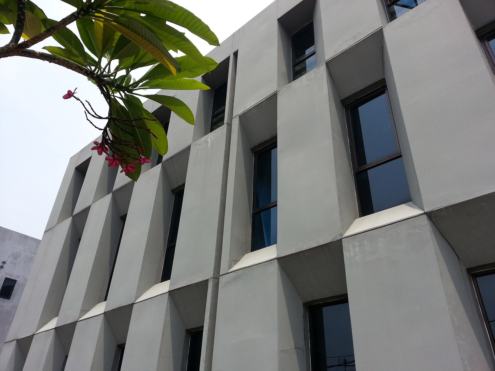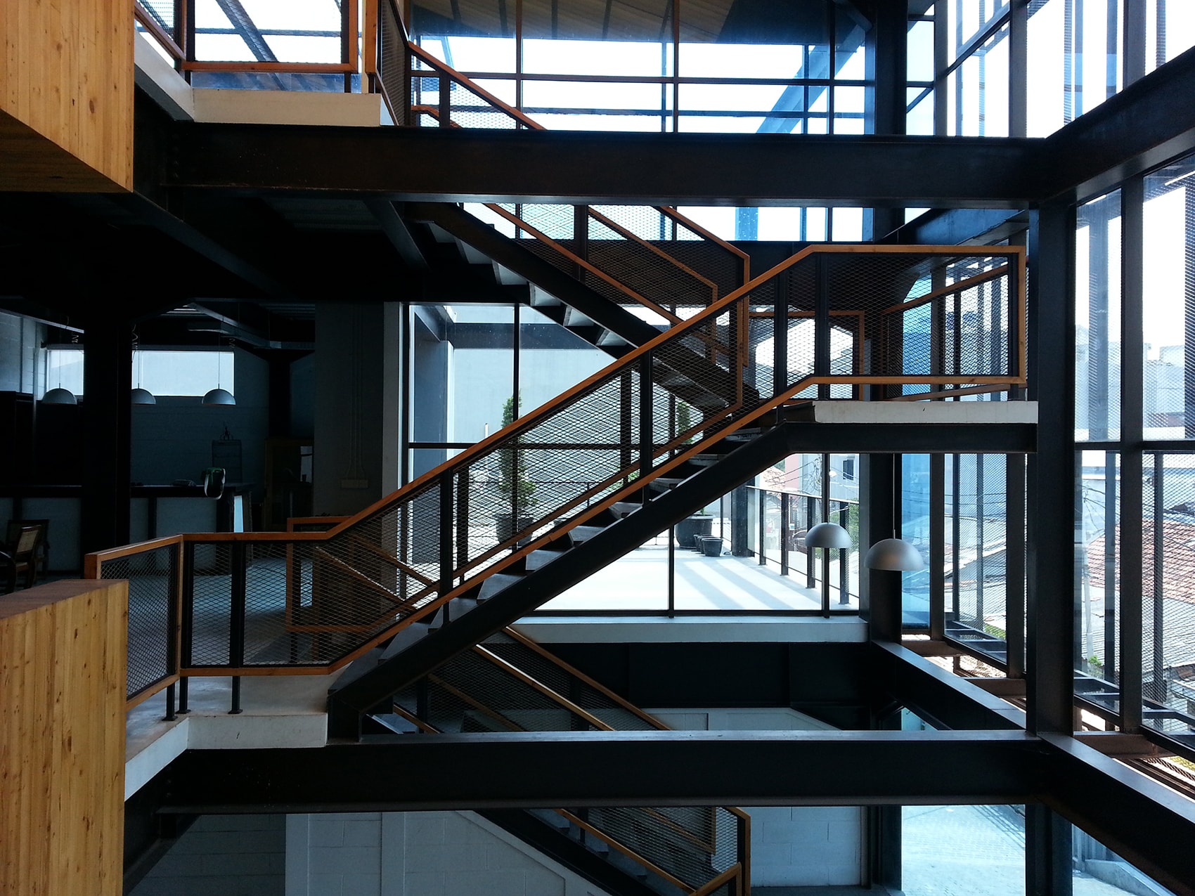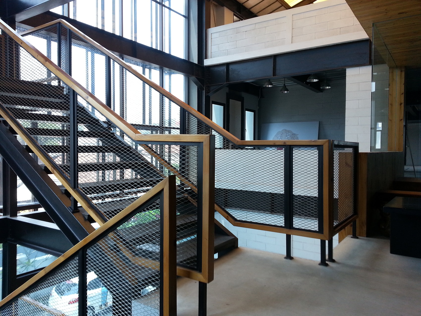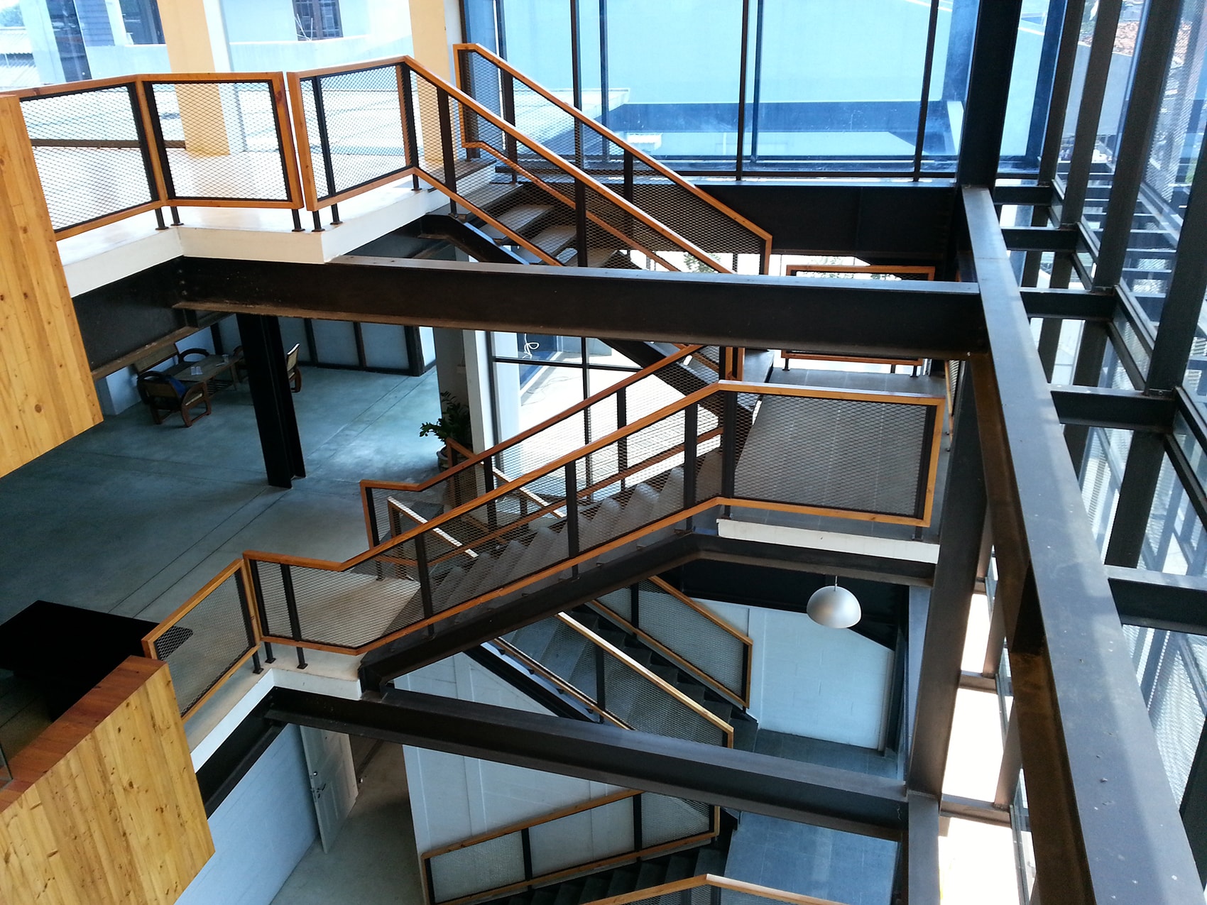 Set in a densely populated low rise residential neighborhood, the 3 story structure blends in with breaking the volume into three distinct parts. The 4 story dramatic lobby covered in layered expanded steel mesh for privacy.
