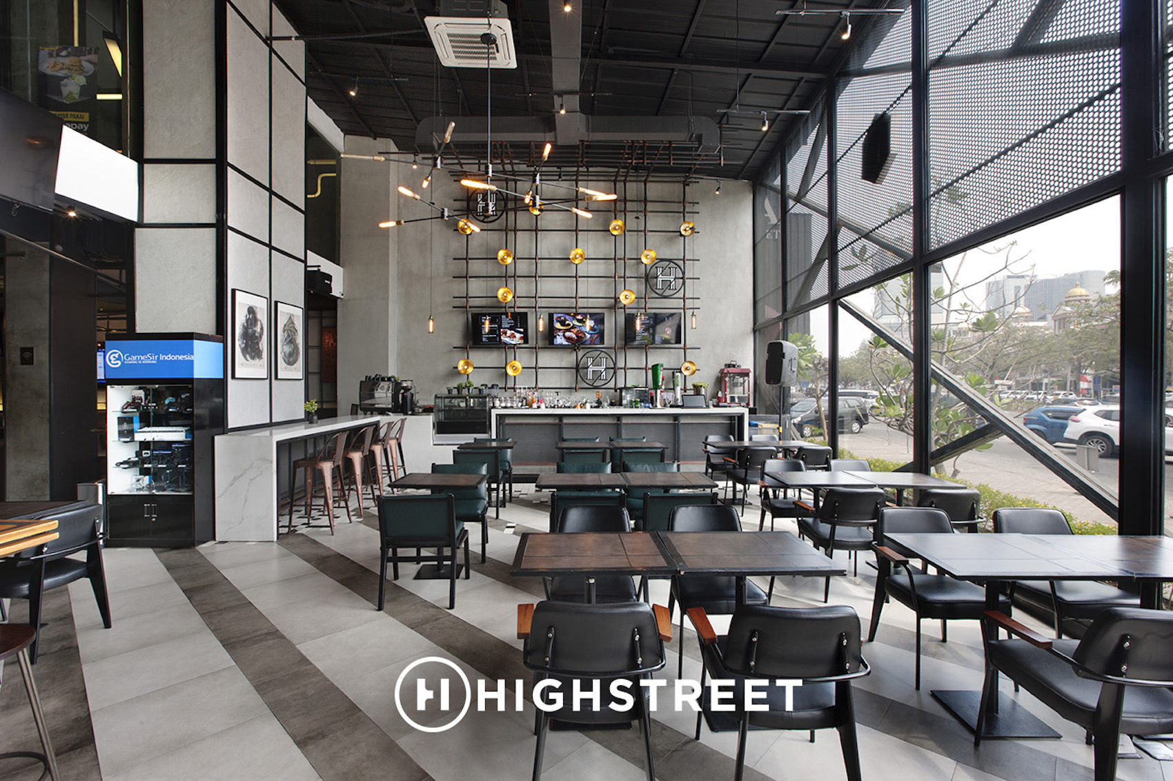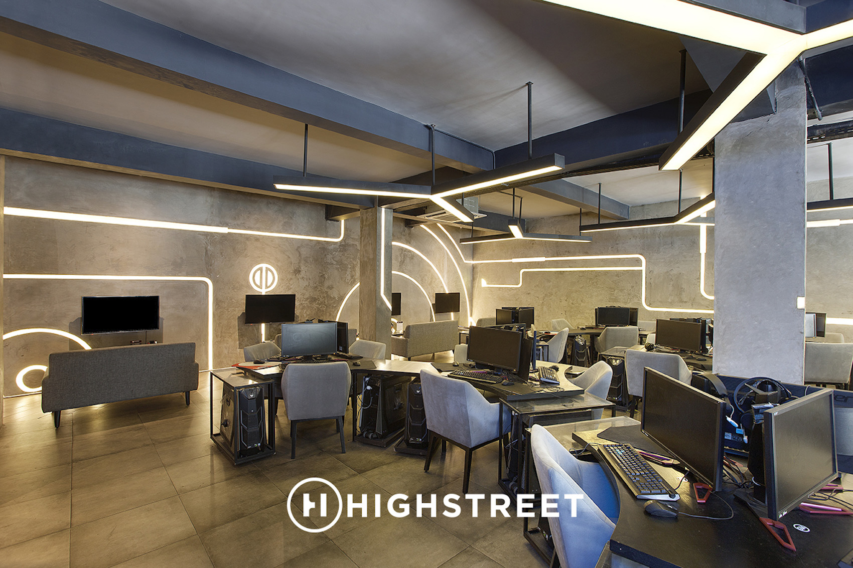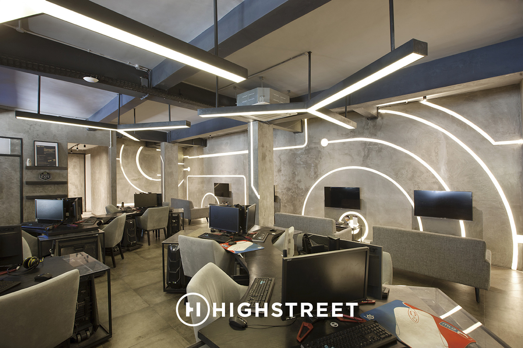 High Grounds located in Pantai Indah Kapuk area is the first Premium Gaming Lounge Arena in Indonesia. High Street has been chosen to be the Interior Design Consultant to deliver this new concept along with other supporting functions of restaurant, coffee shop, bar. Our architect team wraps the façade of three adjoining shophouses sets the tone for the futuristic design theme, through its wire mesh panels lighted with LED strip light which gives a cool presence at night time. The bar is located at the entrance of the building with a double-height high ceiling that gives customers a great space to spend their nights and weekends. The bar and restaurant both have gray, black, and copper as its main color combination. Up the 2nd and 3rd floors are the main gaming areas that have dominant black walls with glowing futuristic graphic patterns on them.