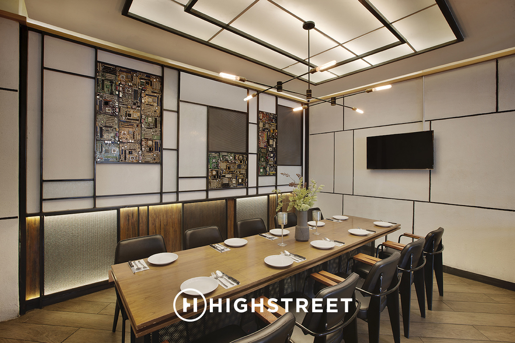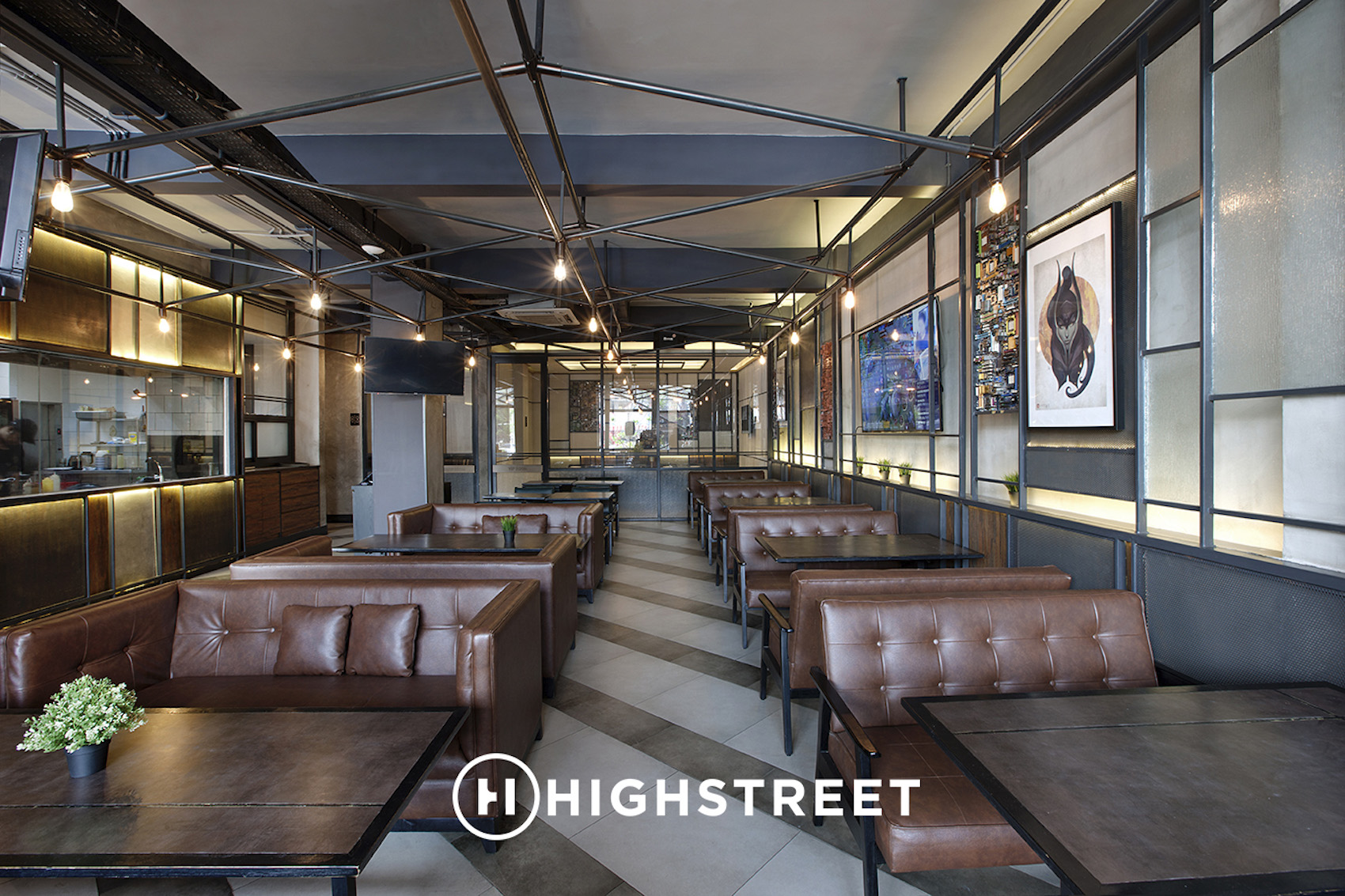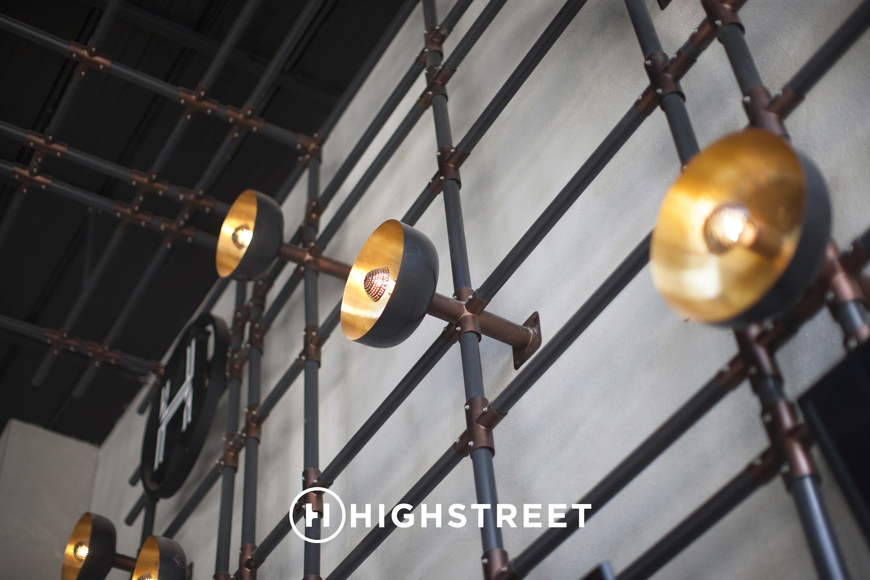 High Grounds located in Pantai Indah Kapuk area is the first Premium Gaming Lounge Arena in Indonesia. High Street has been chosen to be the Interior Design Consultant to deliver this new concept along with other supporting functions of restaurant, coffee shop, bar. Our architect team wraps the façade of three adjoining shophouses sets the tone for the futuristic design theme, through its wire mesh panels lighted with LED strip light which gives a cool presence at night time. The bar is located at the entrance of the building with a double-height high ceiling that gives customers a great space to spend their nights and weekends. The bar and restaurant both have gray, black, and copper as its main color combination. Up the 2nd and 3rd floors are the main gaming areas that have dominant black walls with glowing futuristic graphic patterns on them.