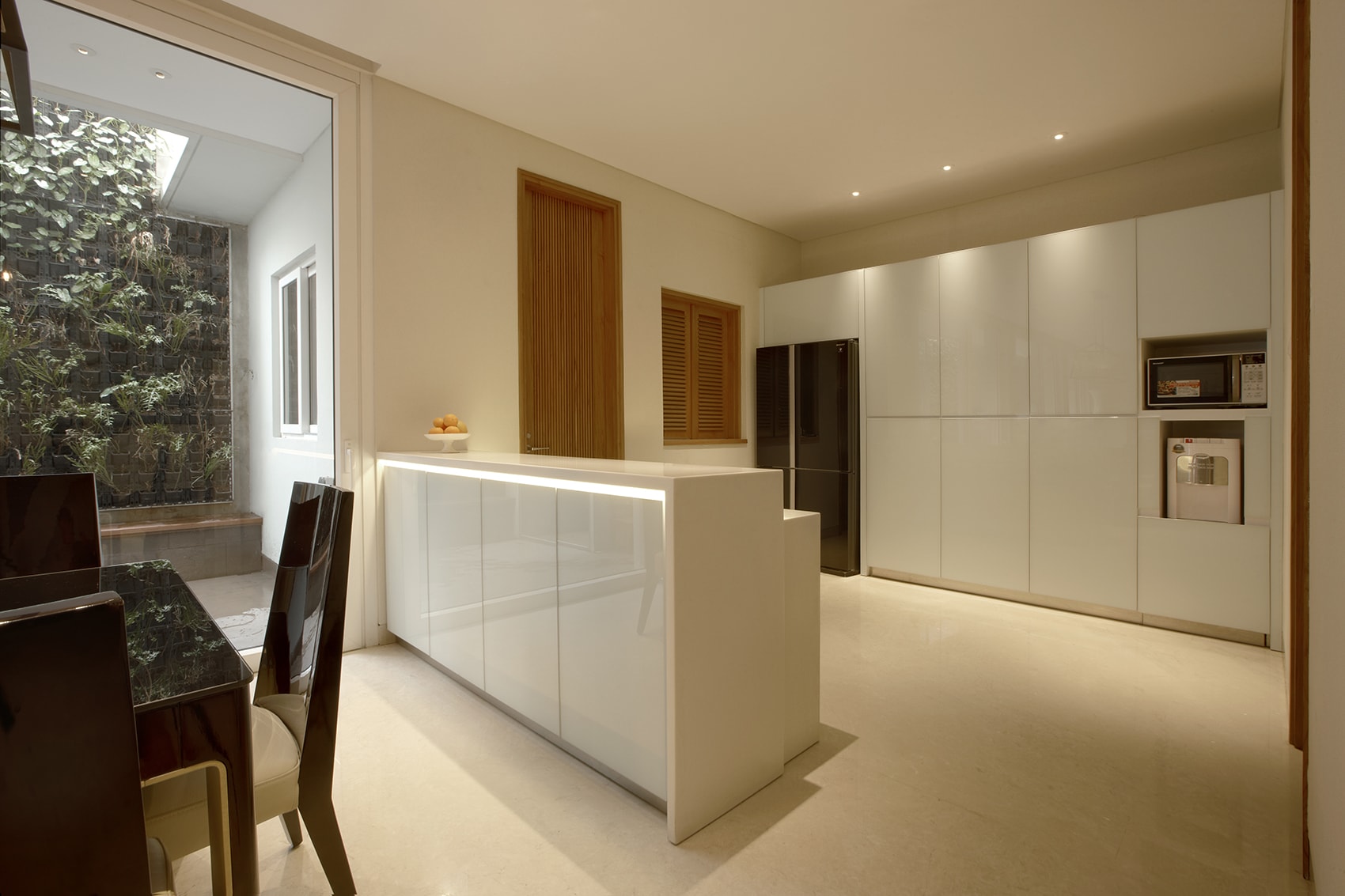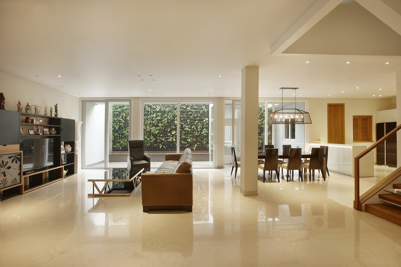 This is a house interior and architecture renovation project in Old Town Jakarta area. Originally, the house was two old townhouses combined into one. The interior design pallete is a calm pastel and cream color from various materials. Cream colored marble flooring becomes the main material of which all the other surface colors follow. We use all LED spot lighting to and repurpose existing rooms into a large space as an exercise in sustainable design.