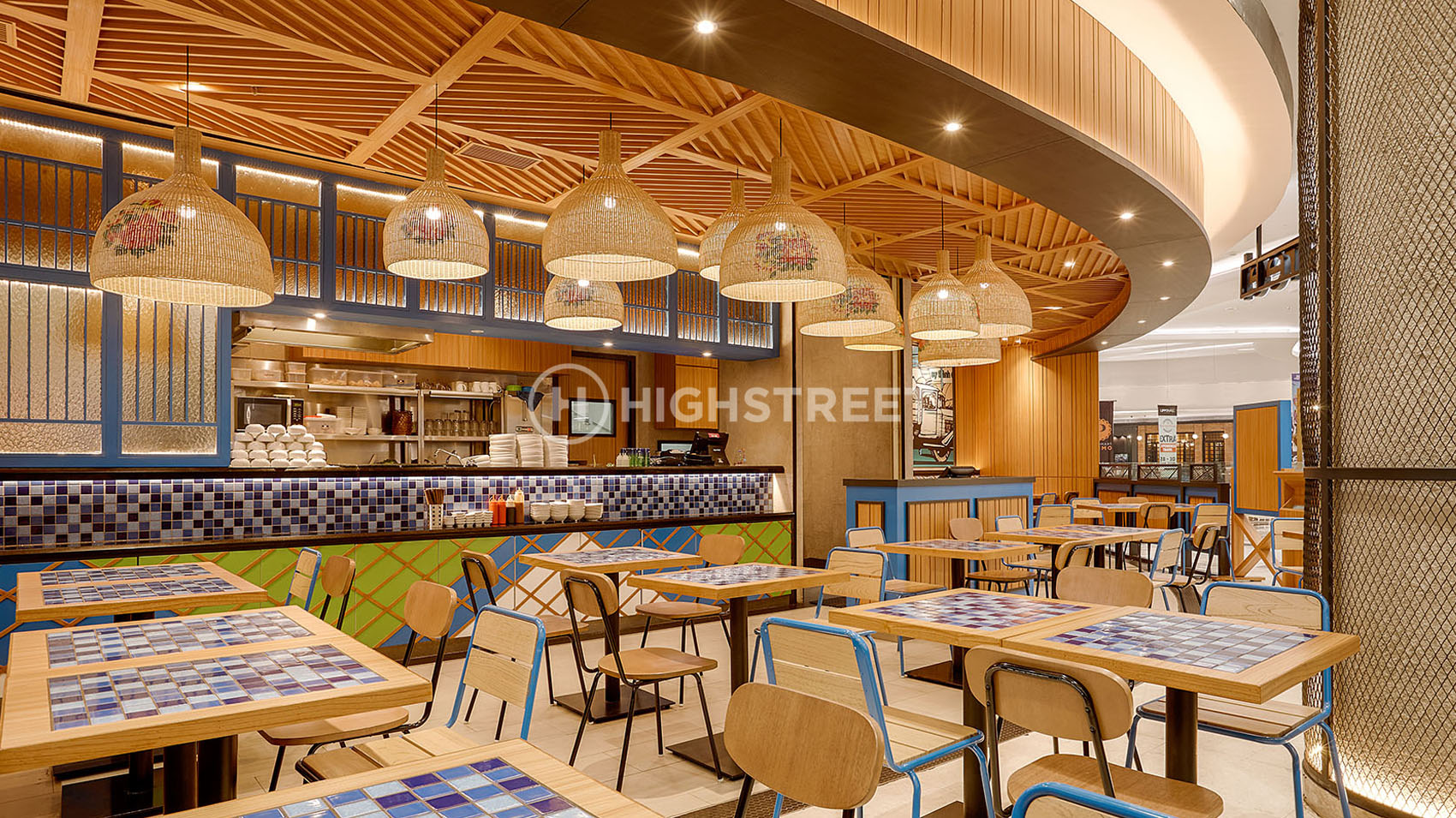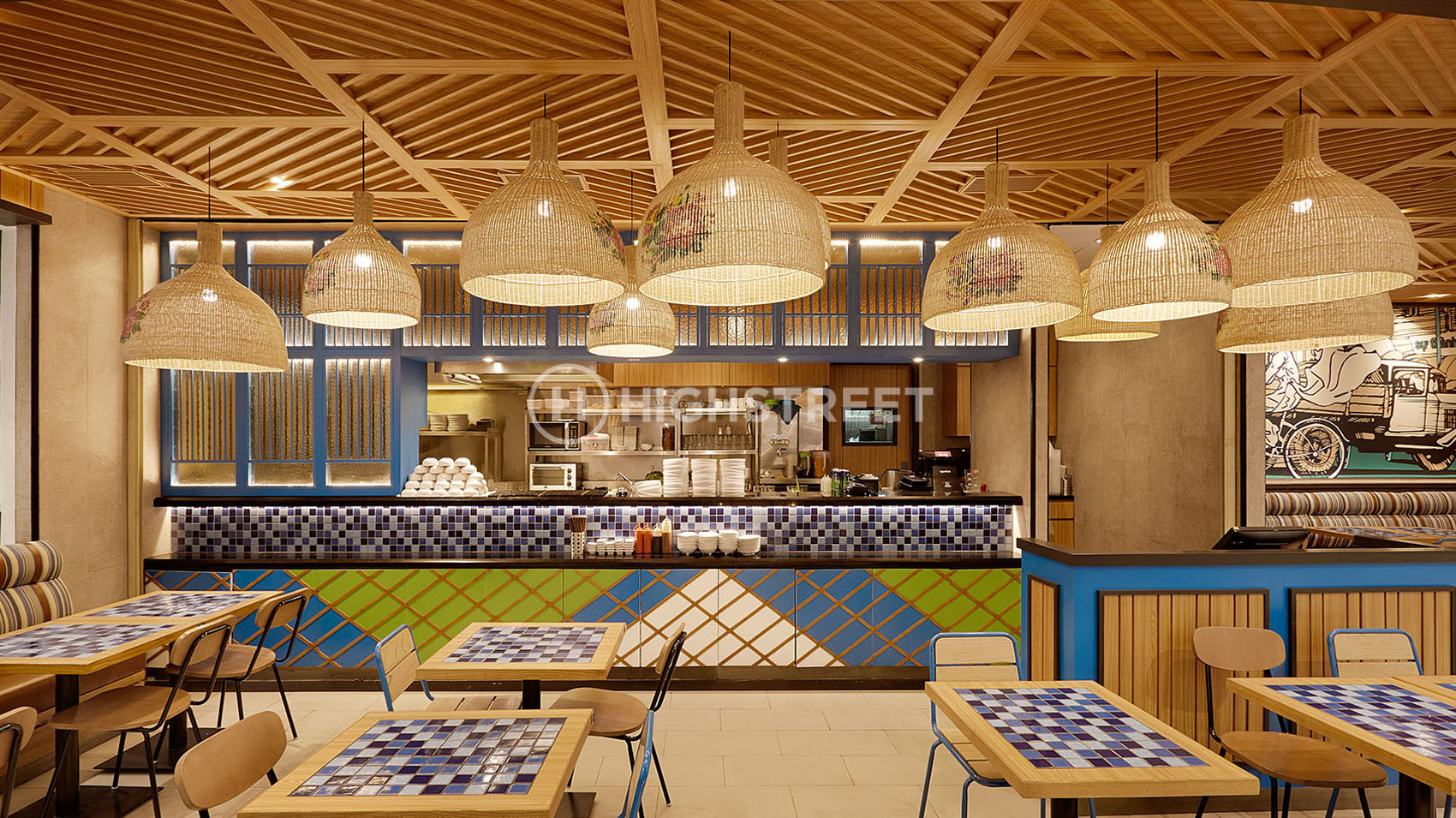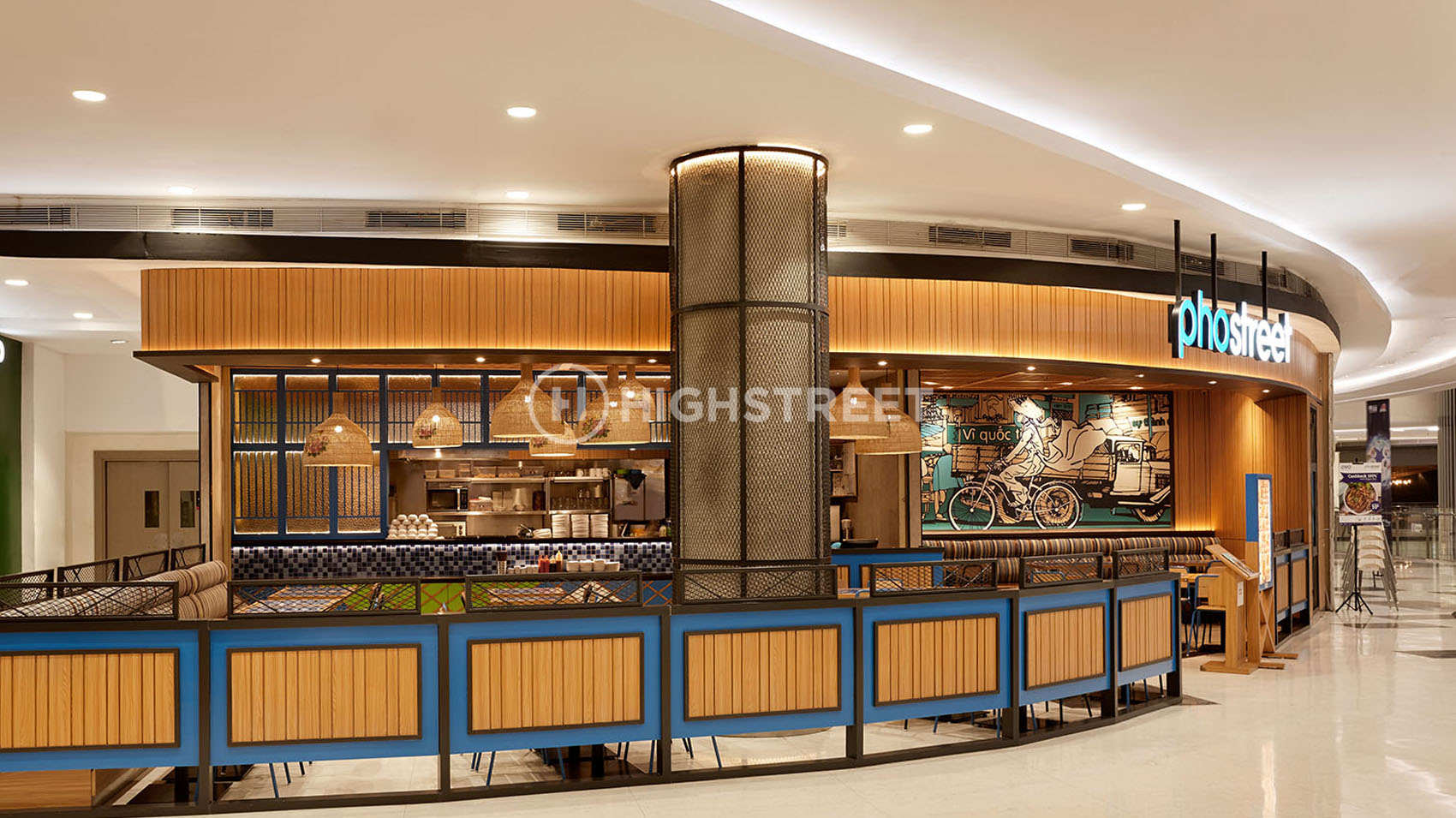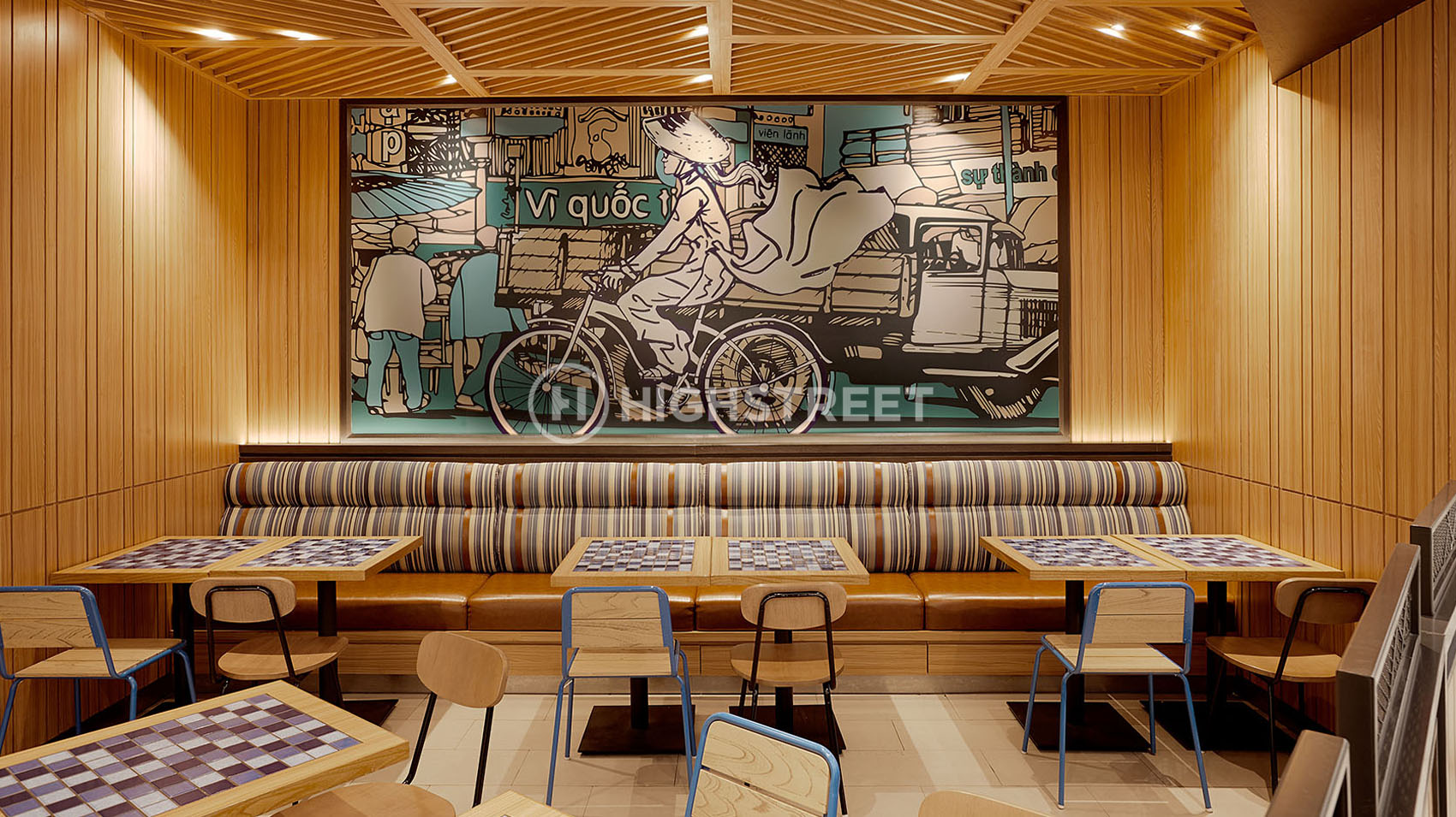 The main concept of Pho Street is casual dining. They aim to bring nuances of enjoying Vietnamese street food on the main streets in Saigon, Vietnam. To create such a concept, Highstreet picked light tone color with a combination of natural ambiance that comes from the wood material. The hypergraphic is also used to expose the lively streets in Saigo, which is filled with food merchants and tourists.