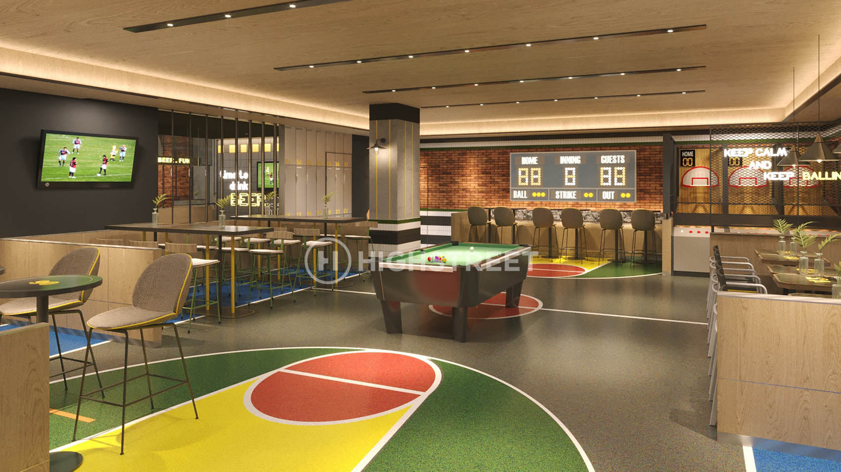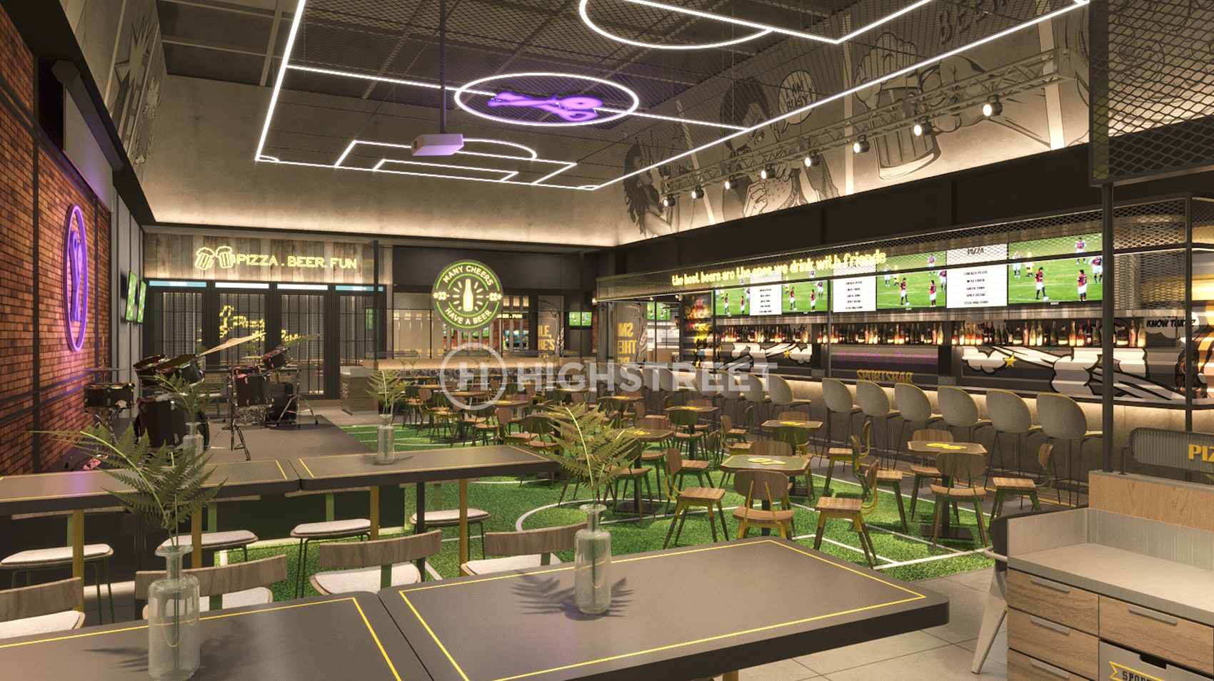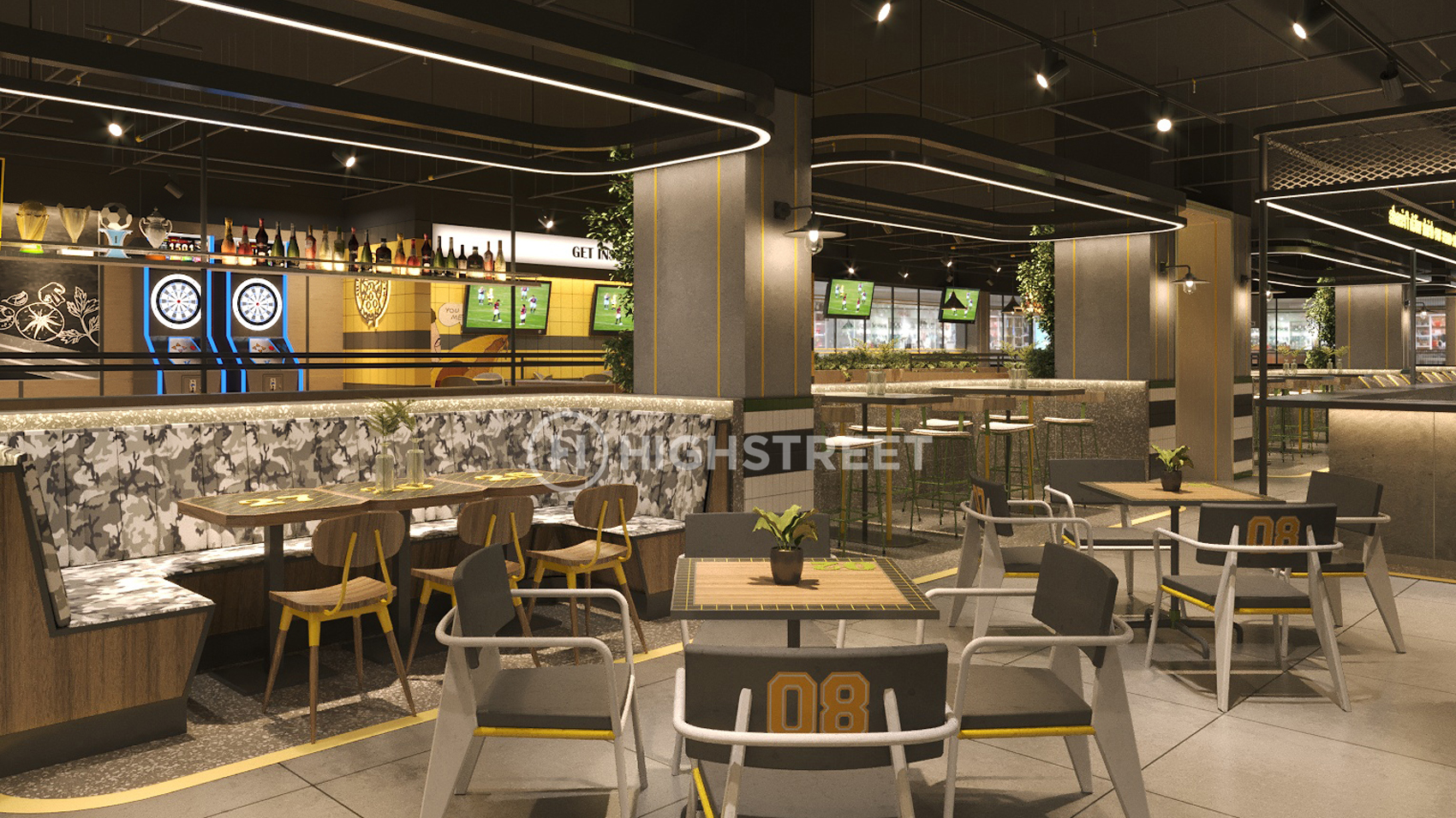 Staying within the main concept as a sports bar, we divided the venue into 2 main areas. The first