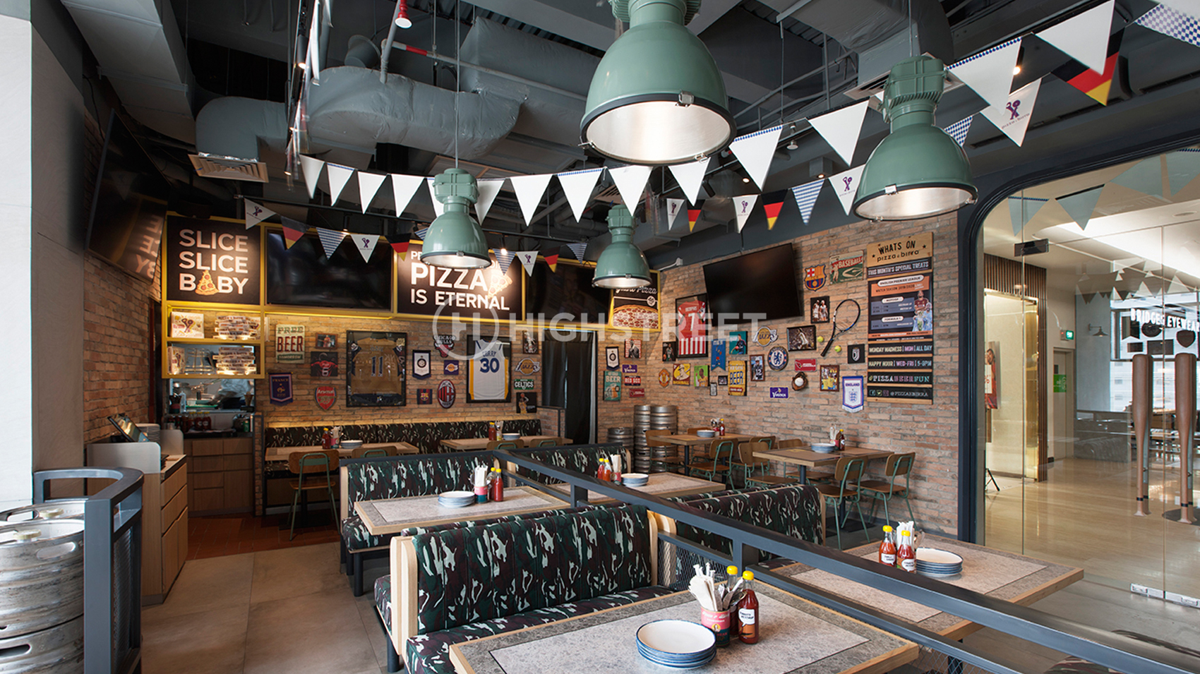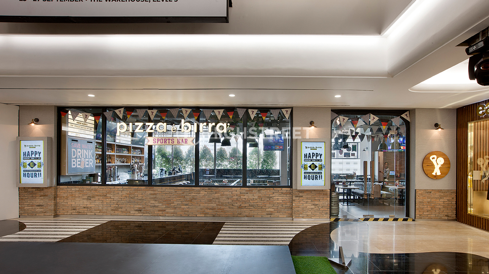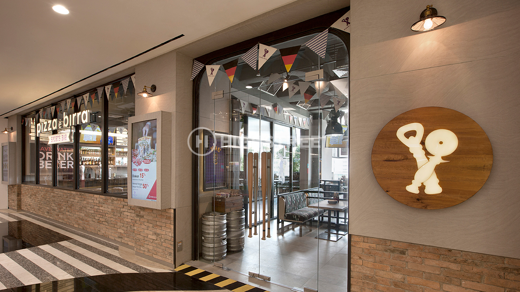 We chose a sports bar to serve as the design concept theme. Divide a special area for smoking and non-smoking areas. Our team is very concerned about the division of rooms in designing the interior of this Pizza E Birra Plaza by maximizing the space that will be used for band performances in holding live music and also the dining area. With strong graphics in the interior design that can represent the sports bar concept. To support the interior appearance that is fun and energetic, we use colours that represent the spirit of the Pizza E Birra Plaza Indonesia brand.