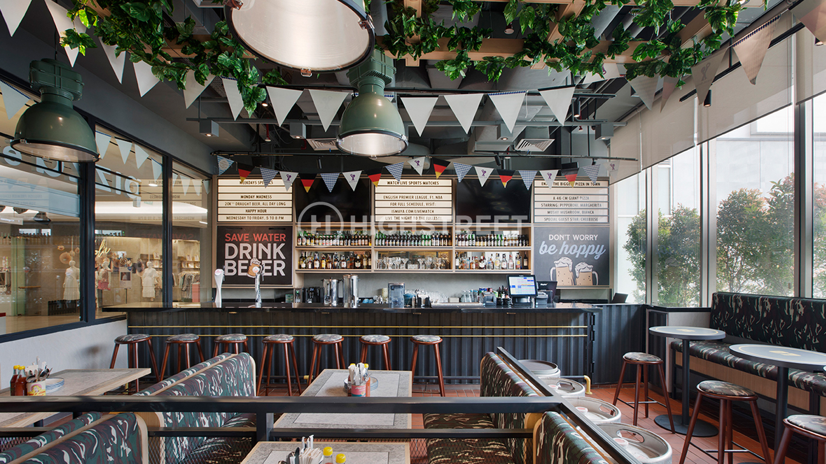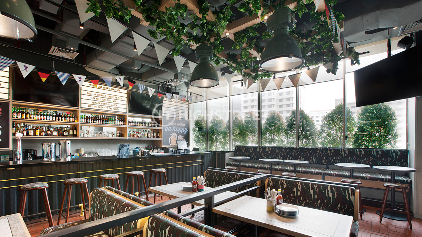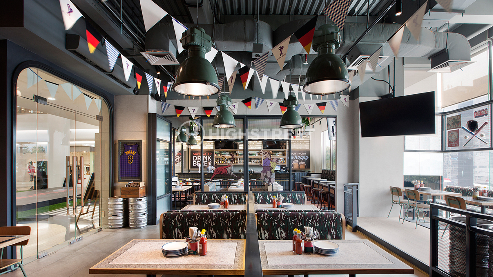We chose a sports bar to serve as the design concept theme. Divide a special area for smoking and non-smoking areas. Our team is very concerned about the division of rooms in designing the interior of this Pizza E Birra Plaza by maximizing the space that will be used for band performances in holding live music and also the dining area. With strong graphics in the interior design that can represent the sports bar concept. To support the interior appearance that is fun and energetic, we use colours that represent the spirit of the Pizza E Birra Plaza Indonesia brand.