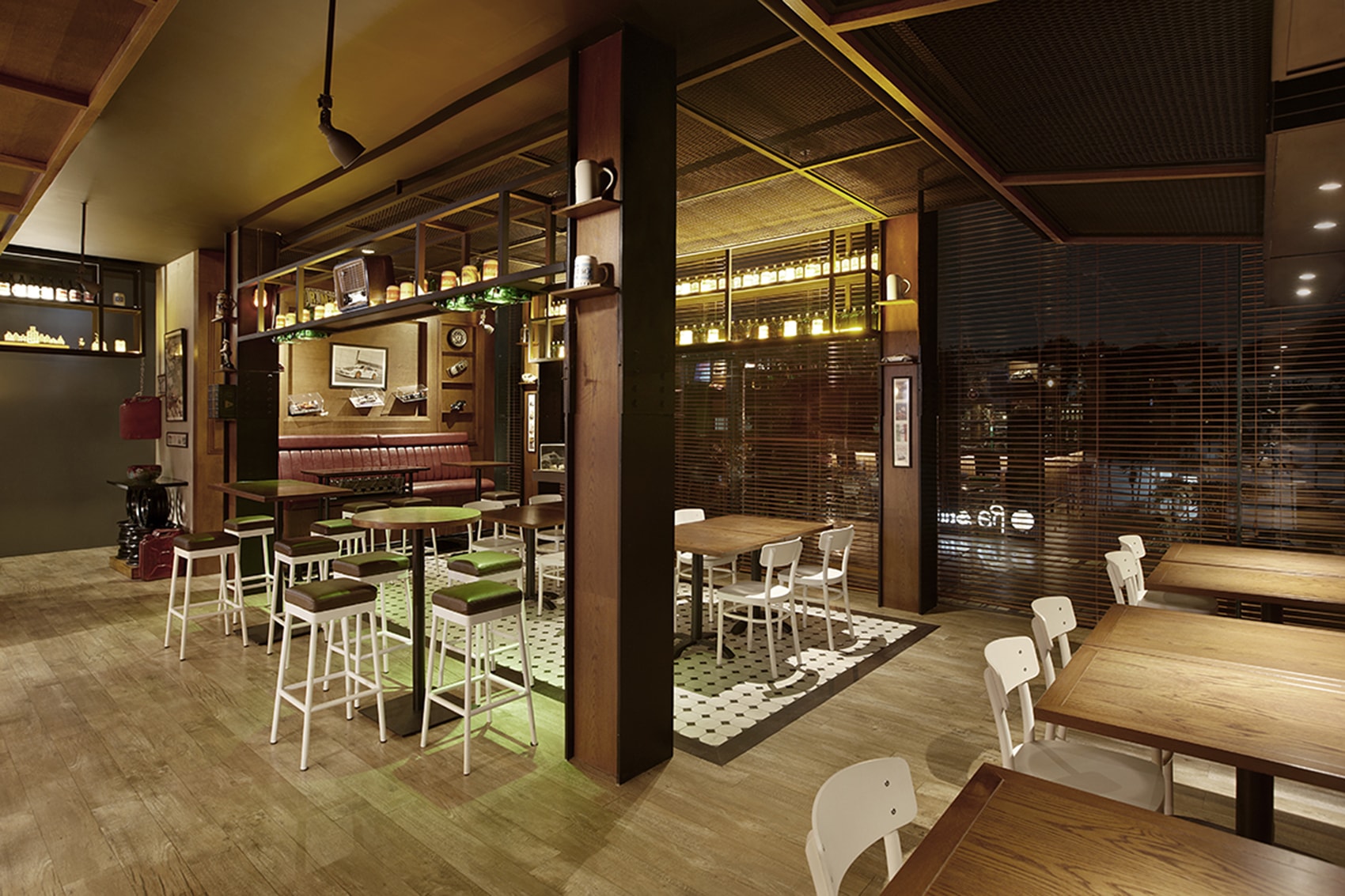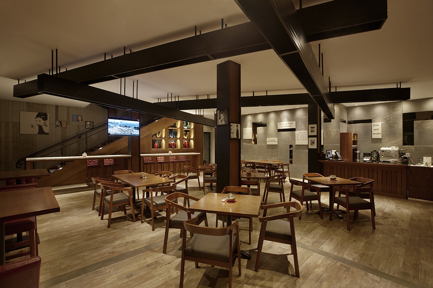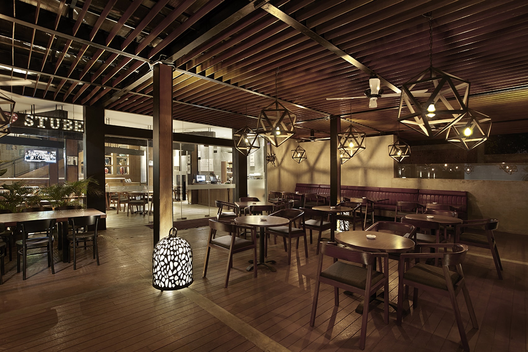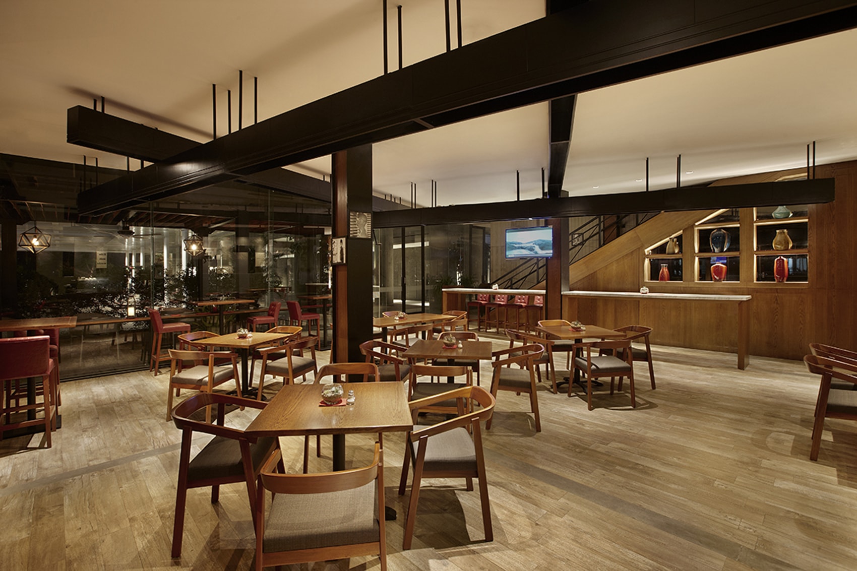 A restaurant and breakfast area for Ra Residence Serviced Apartment and Hotel. Design aspects of the restaurant taken direction from modern tropical minimalist aesthetic. The design team blends interior and exterior space with warm finishings with a pallete of wood, grey, and black.