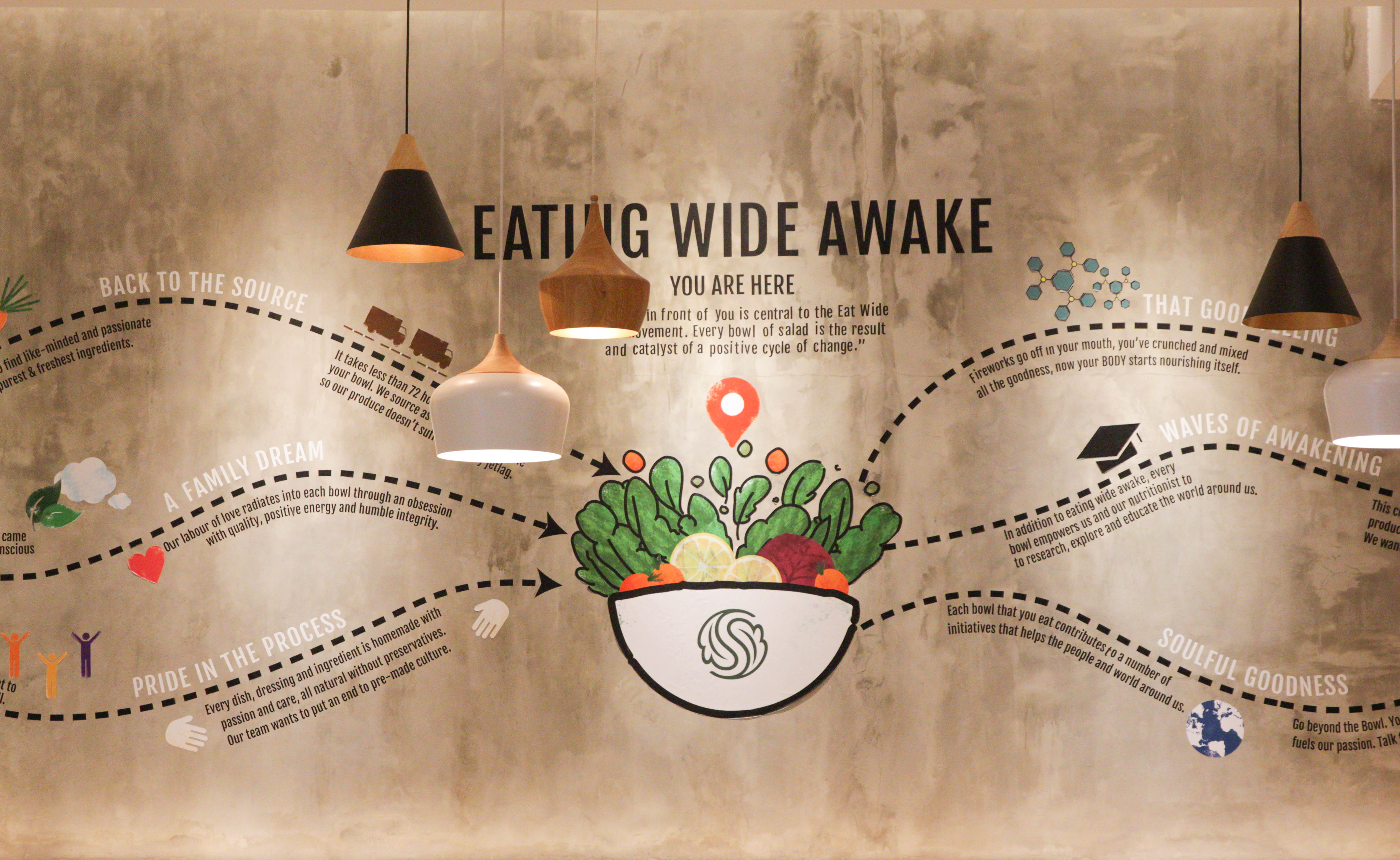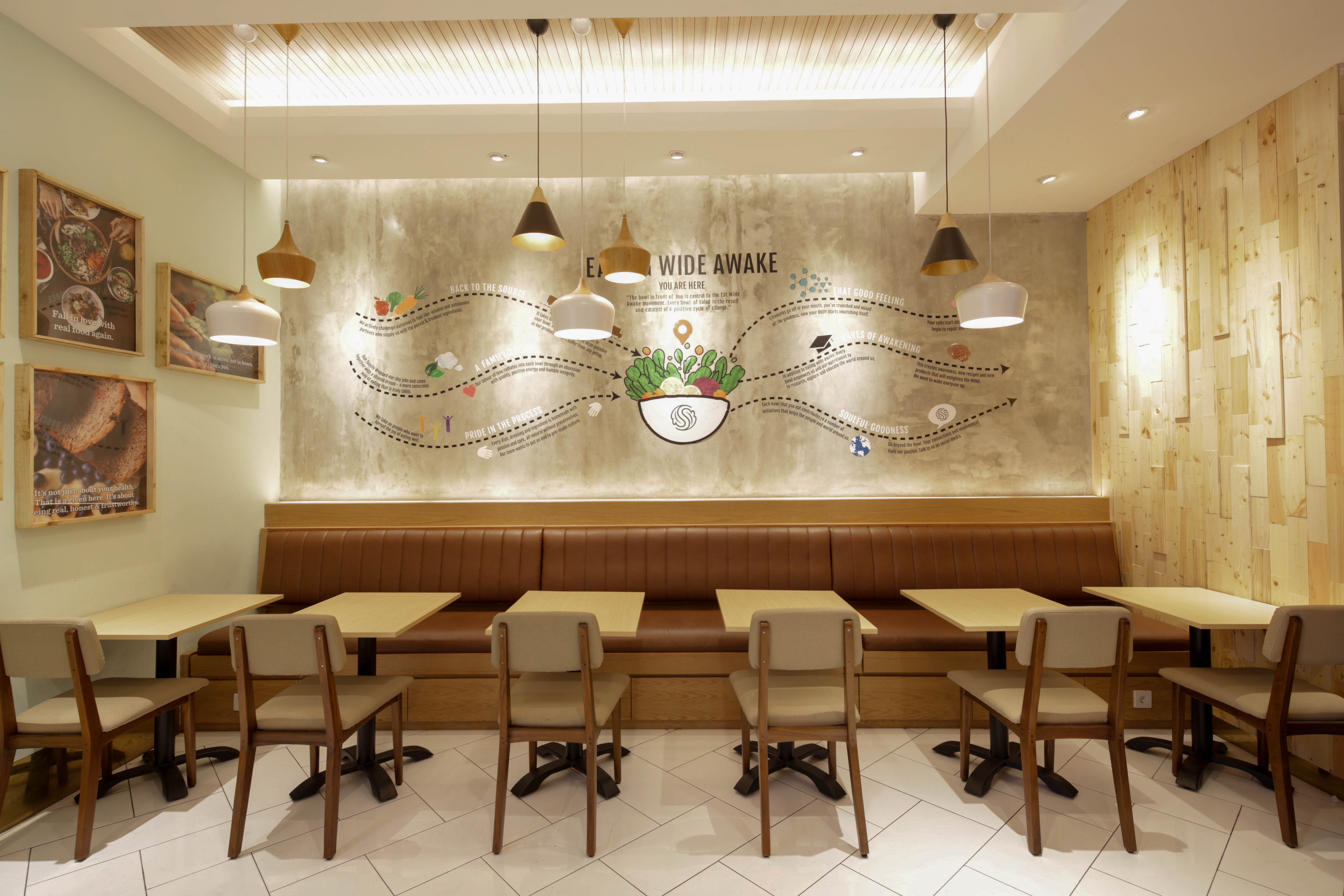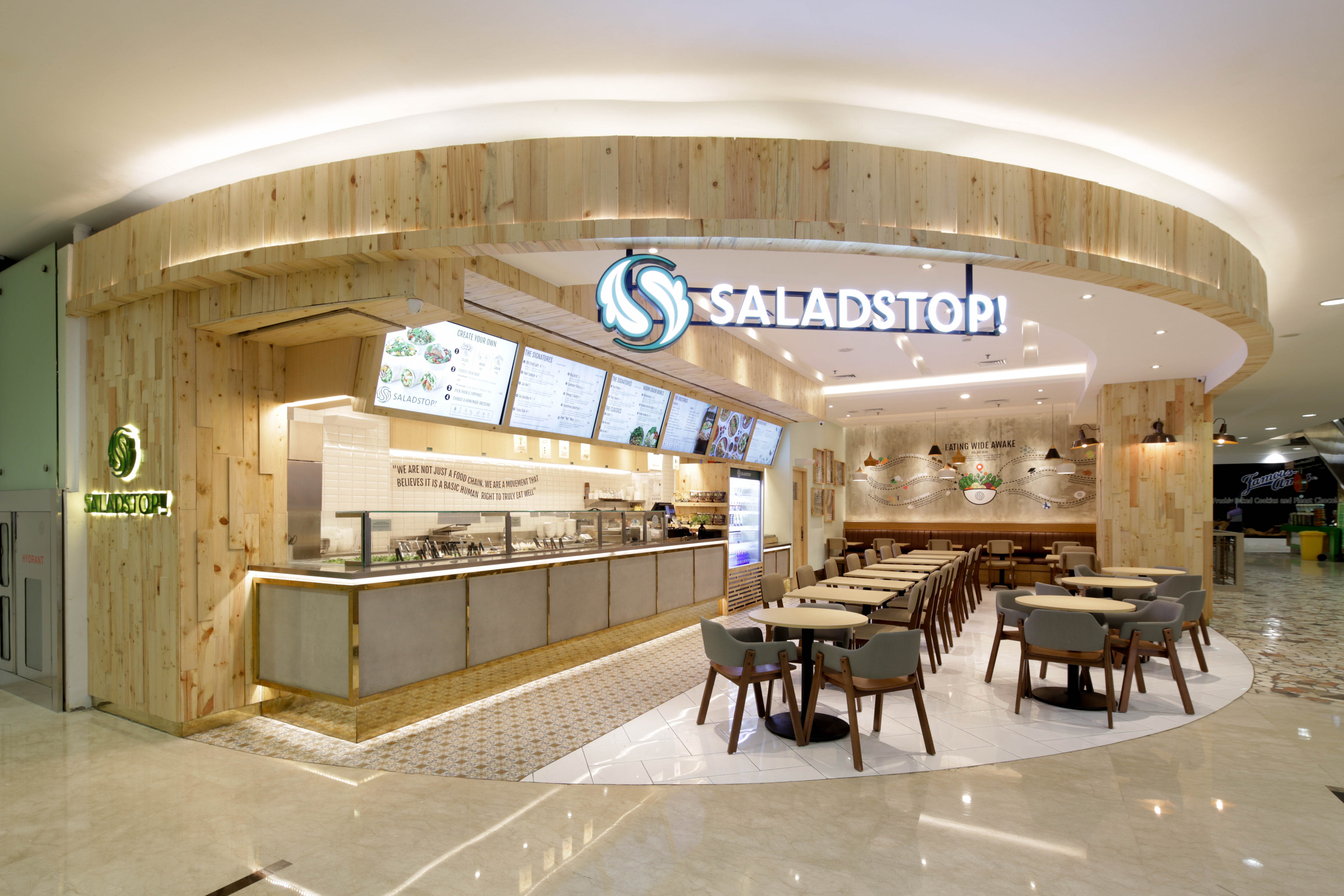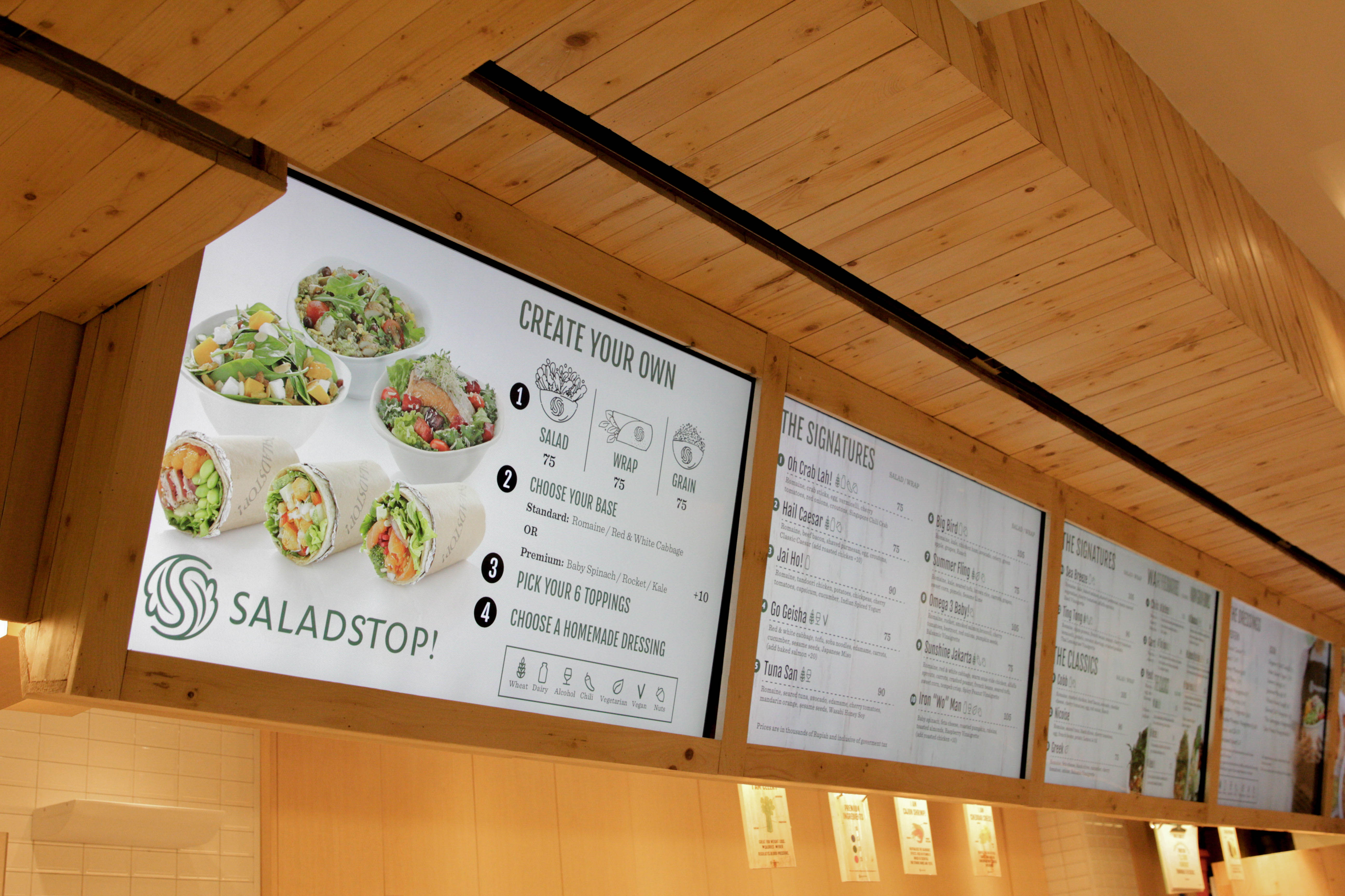 Salad Stop (Singapore chair restaurant) has opened their outlet at Senayan City, Jakarta. They offer salads and super food items to encourage a healthy lifestyle through their products. Healthy lifestyle depends on freshness, and we must visualize it through our design. Since the ordering process is done at the counter so the design really important, Our Interior design team designed this salad restaurant counter as efficiently as possible with open space kitchen so the customers can directly see the process of making a salad. LED screens located on the top of the counter to show the menu selections that are interchangeable and easily maintained.