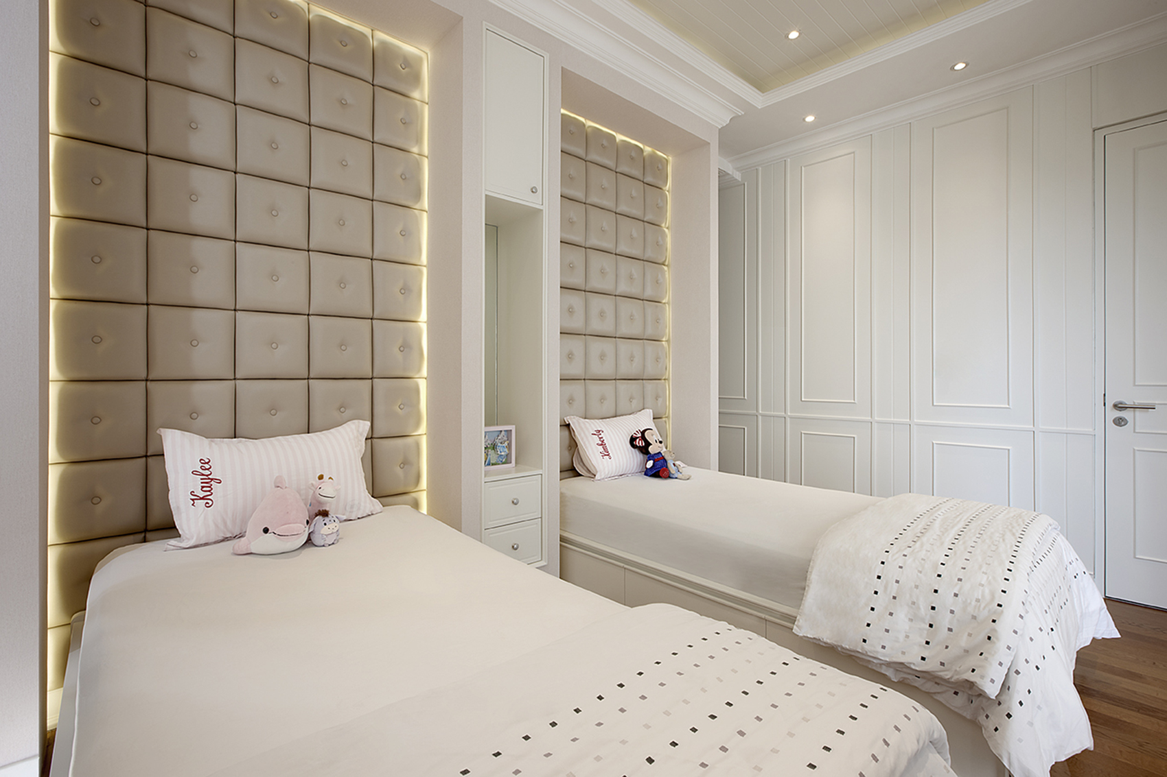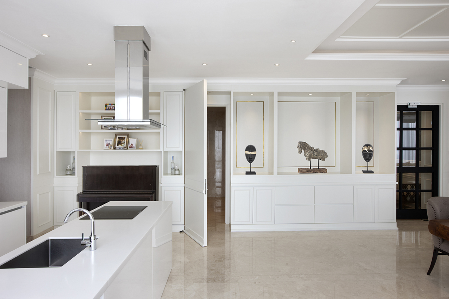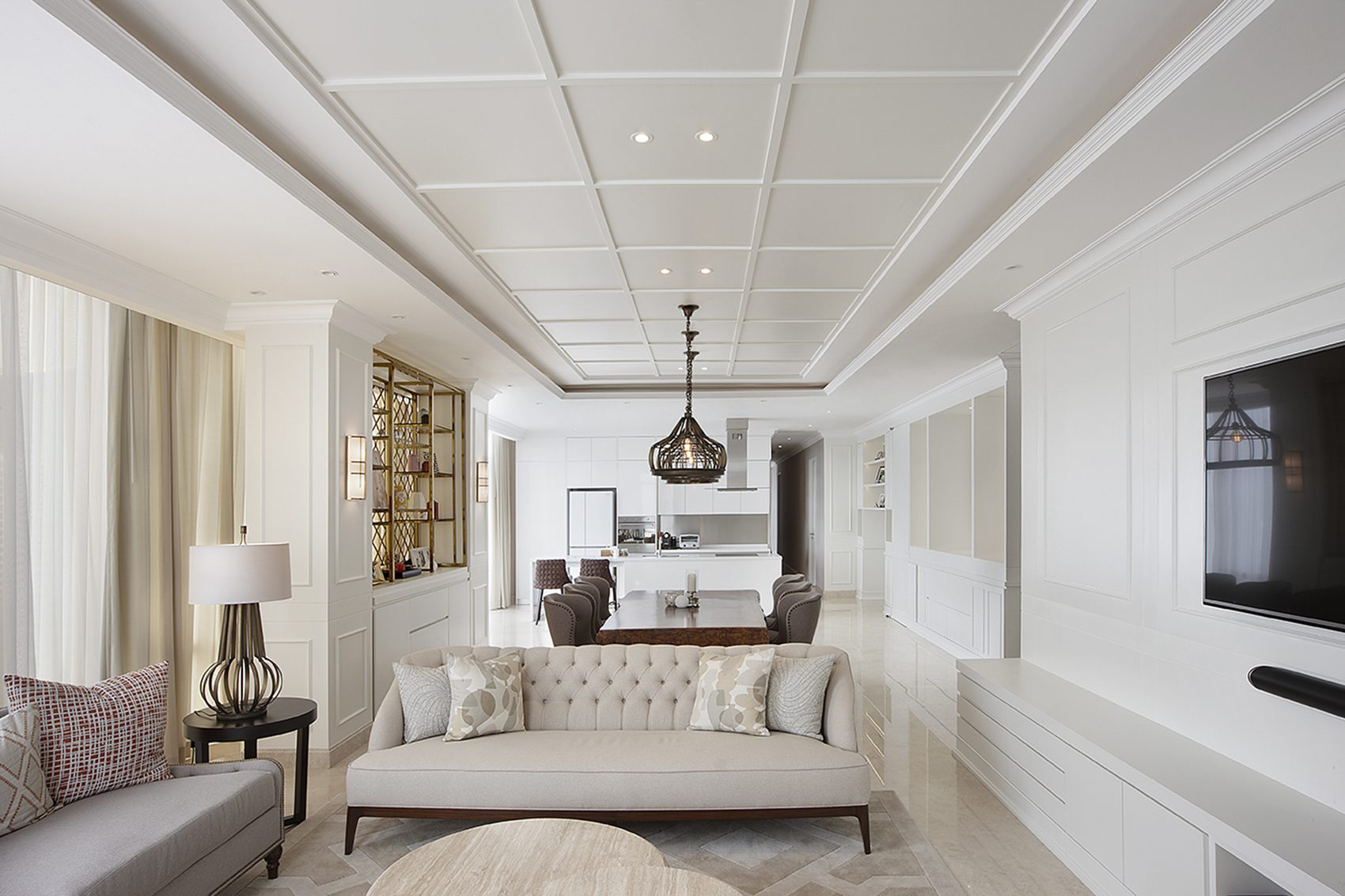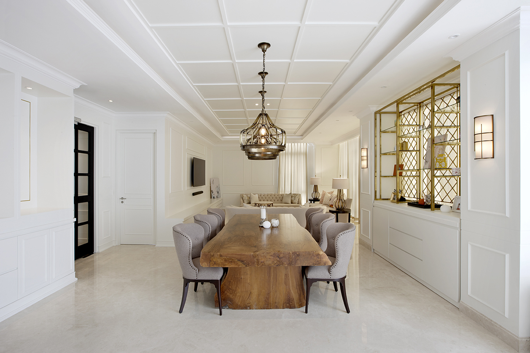 An active family of parent and three children commisioned our Interior Design Team to create a living environment that is cozy and comfortable, but has to distinctly show the personality and character of the family. Calm elements such as the white wall panelling and cream fabric finishes contrast well with the natural teak wood solid slab dining table. The kitchen design blends well with the rest of the living area by using the same composition of finishes.