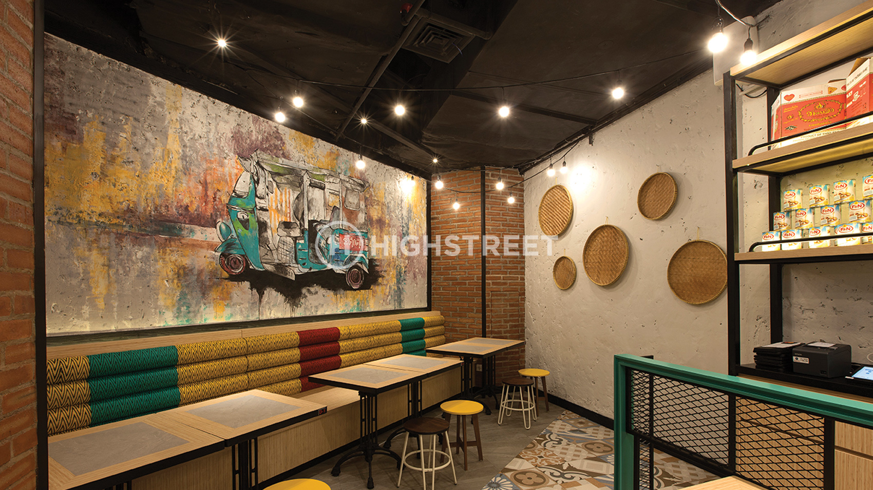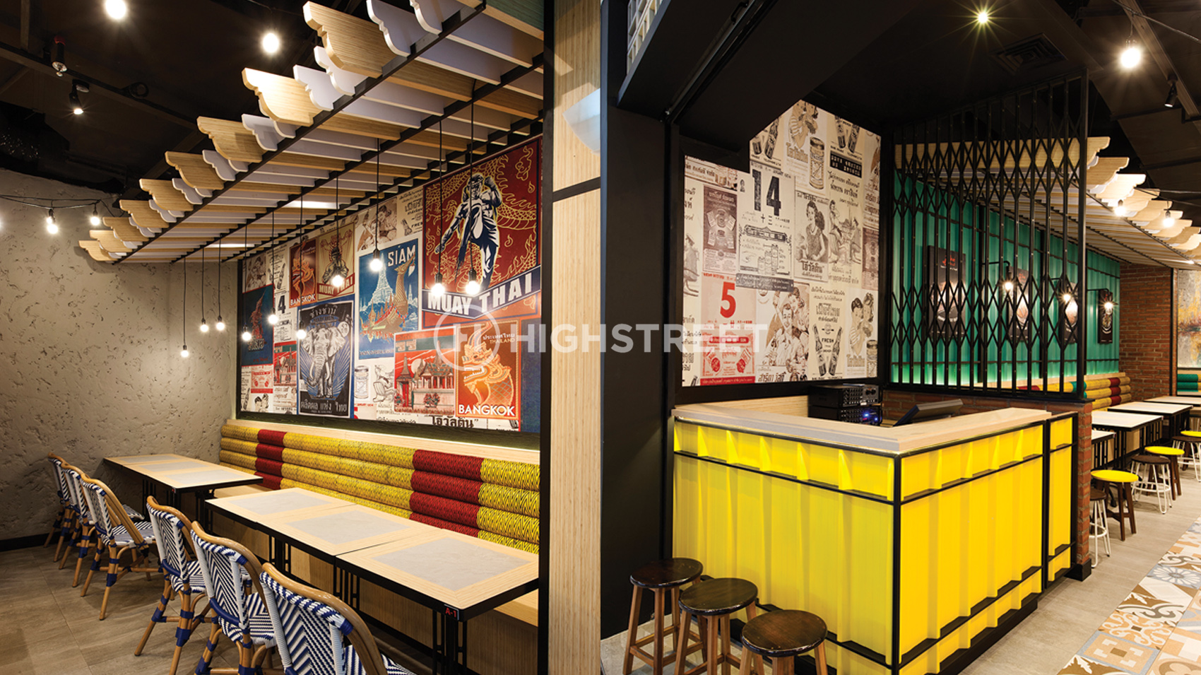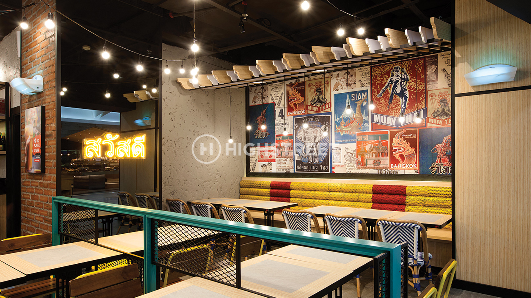 For creating a peaceful and picturesque natural rustic space, our team choose a picture that depicts typical of Thailand such as Muay Thai. We also applied Thailand's colorful street stalls and markets for this restaurant. From the ideas, the customer can still feel the nuance of Thailand in a relaxed and friendly atmosphere.