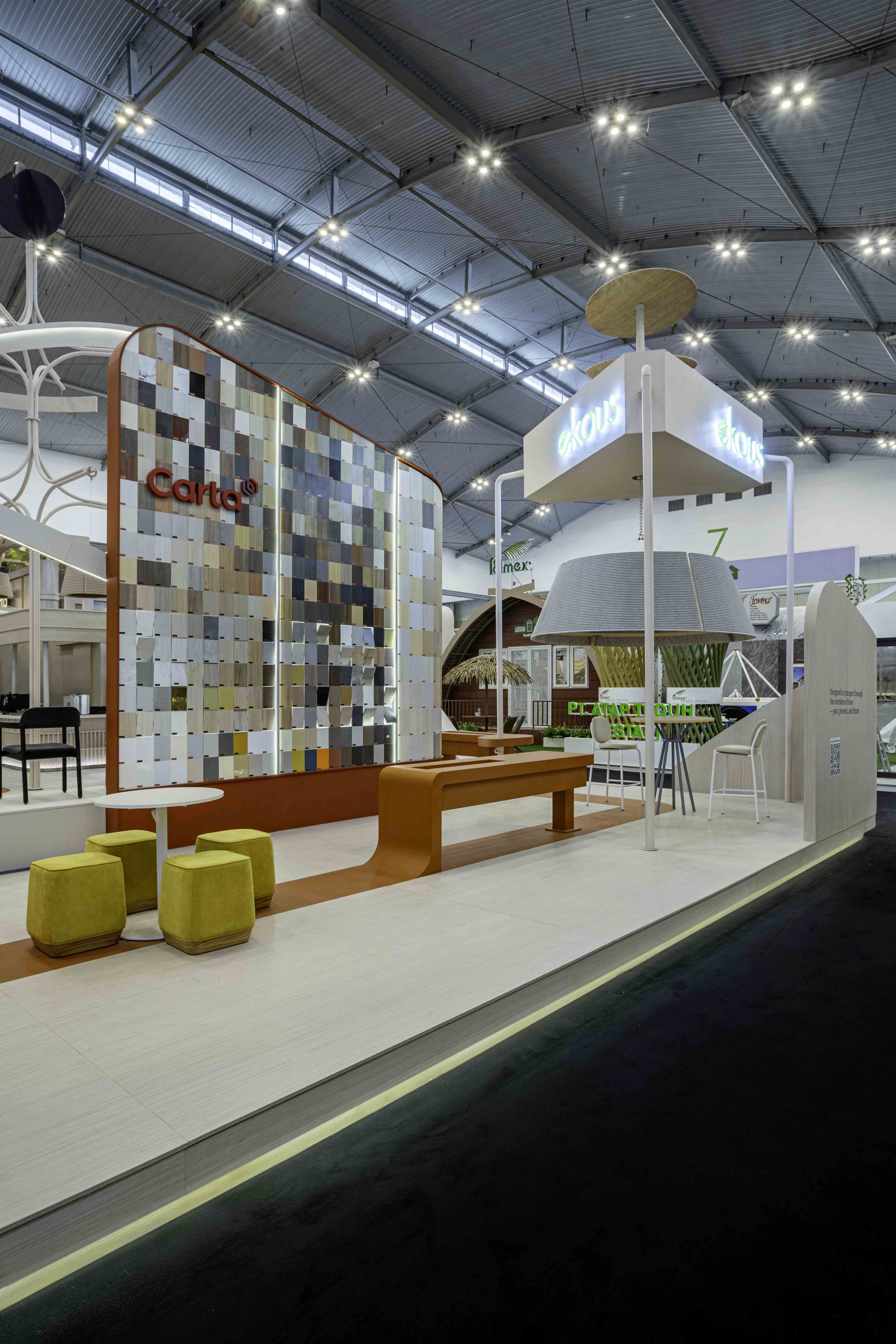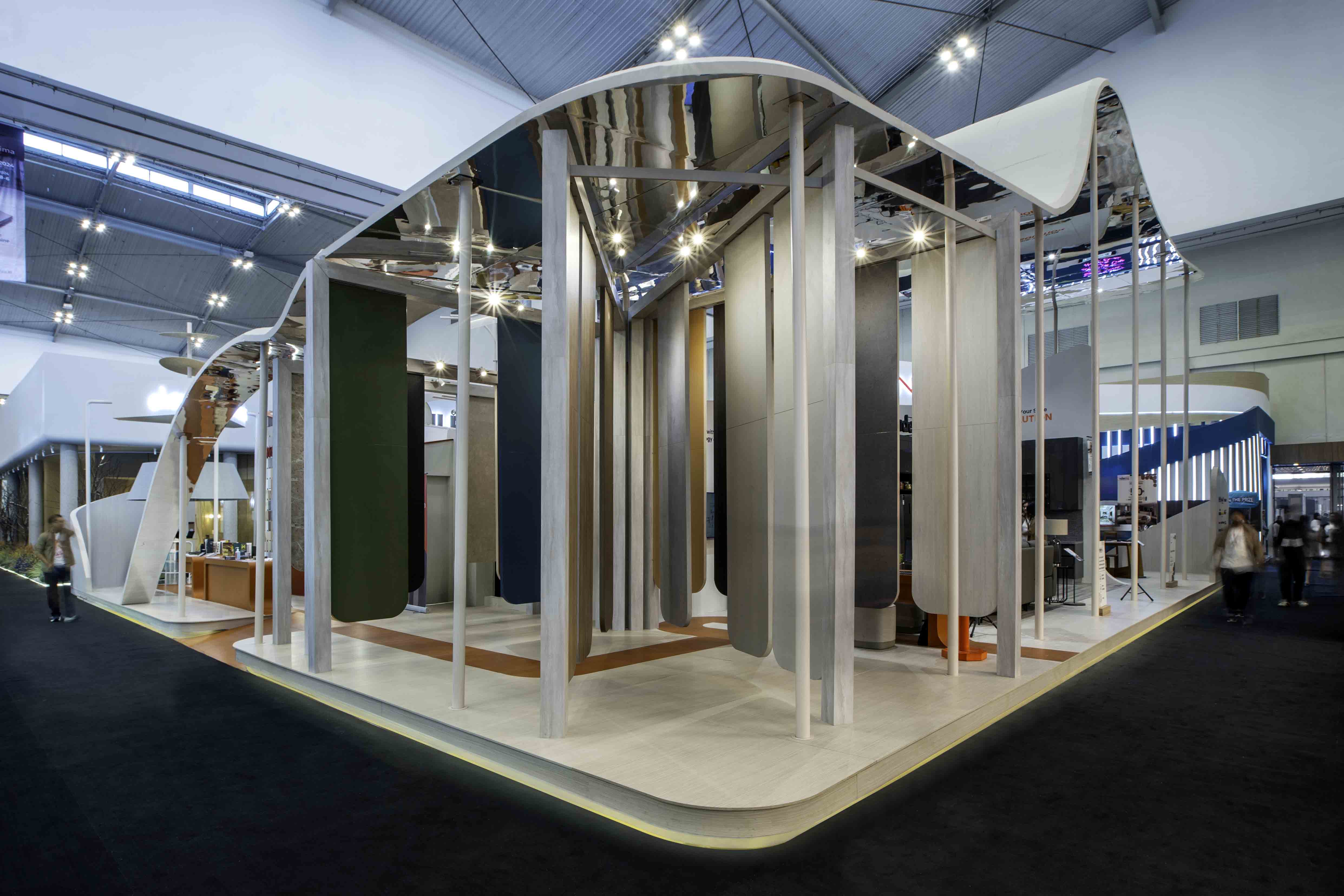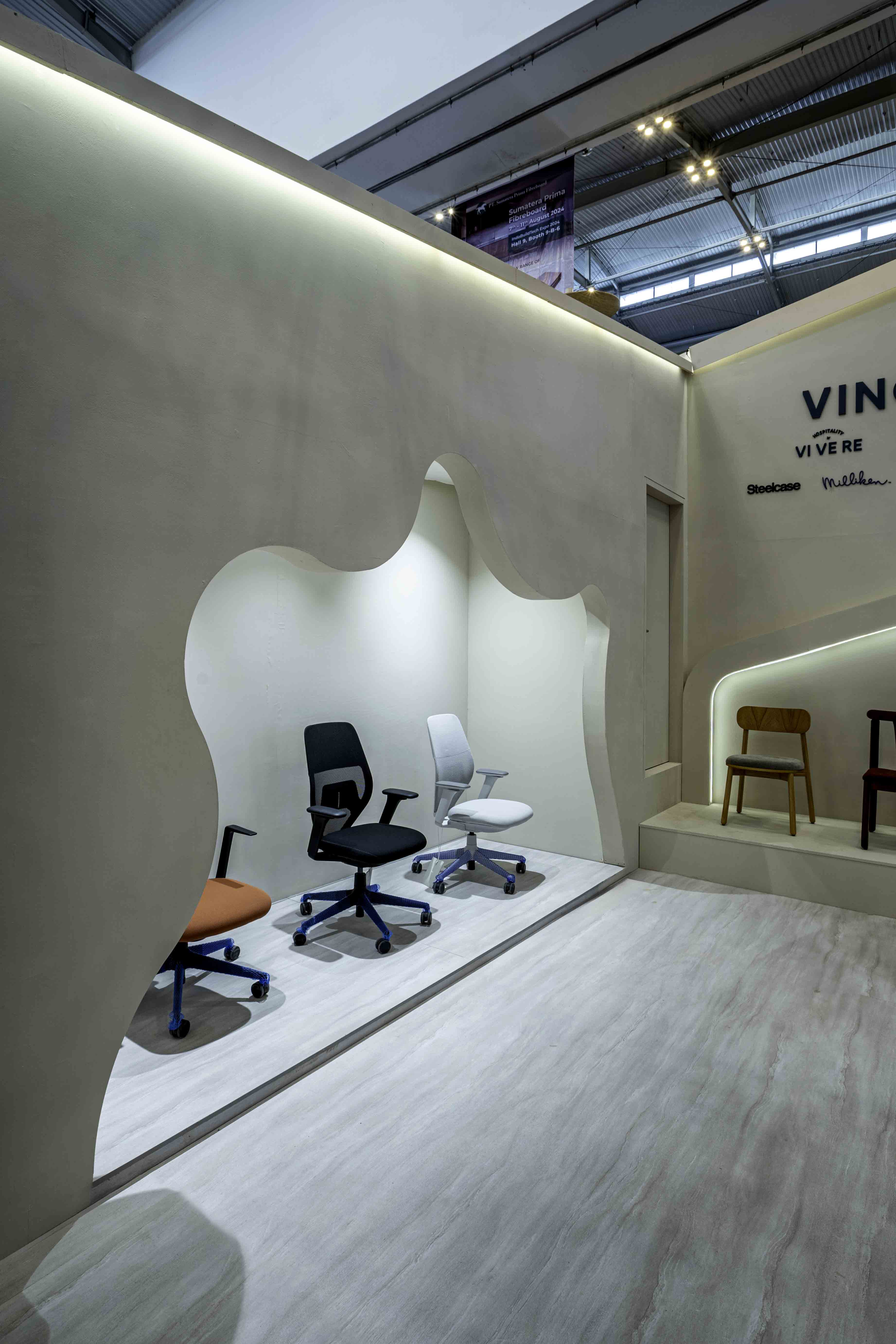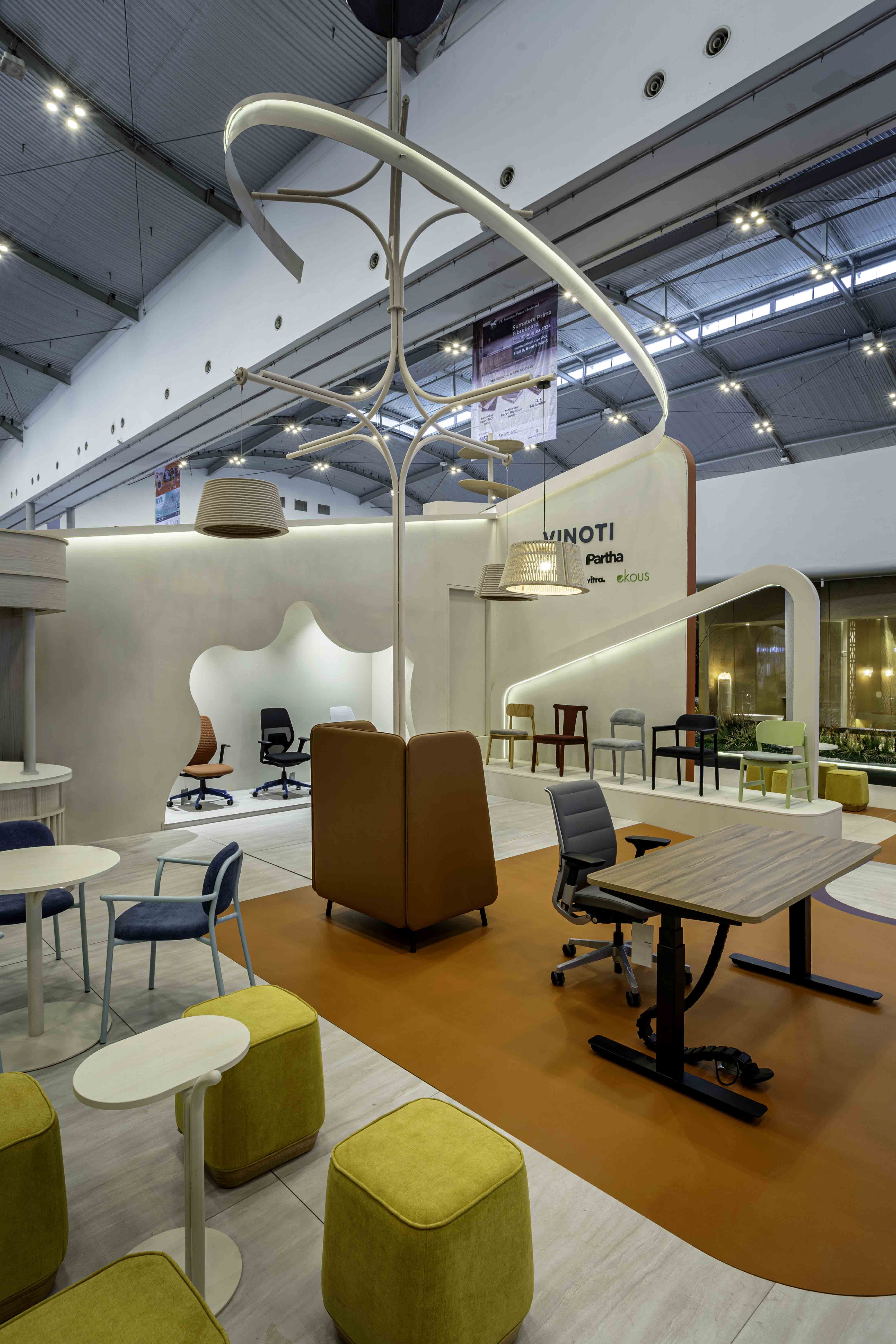 An exhibition booth that defies gravity, where angular walls and rounded shapes merge to form a landscape reminiscent of Martian terrain. The colors are ethereal, the textures otherworldly, yet every piece of furniture, from the plush sofas to the sleek office chairs, calling us to come closer, to touch, to experience.