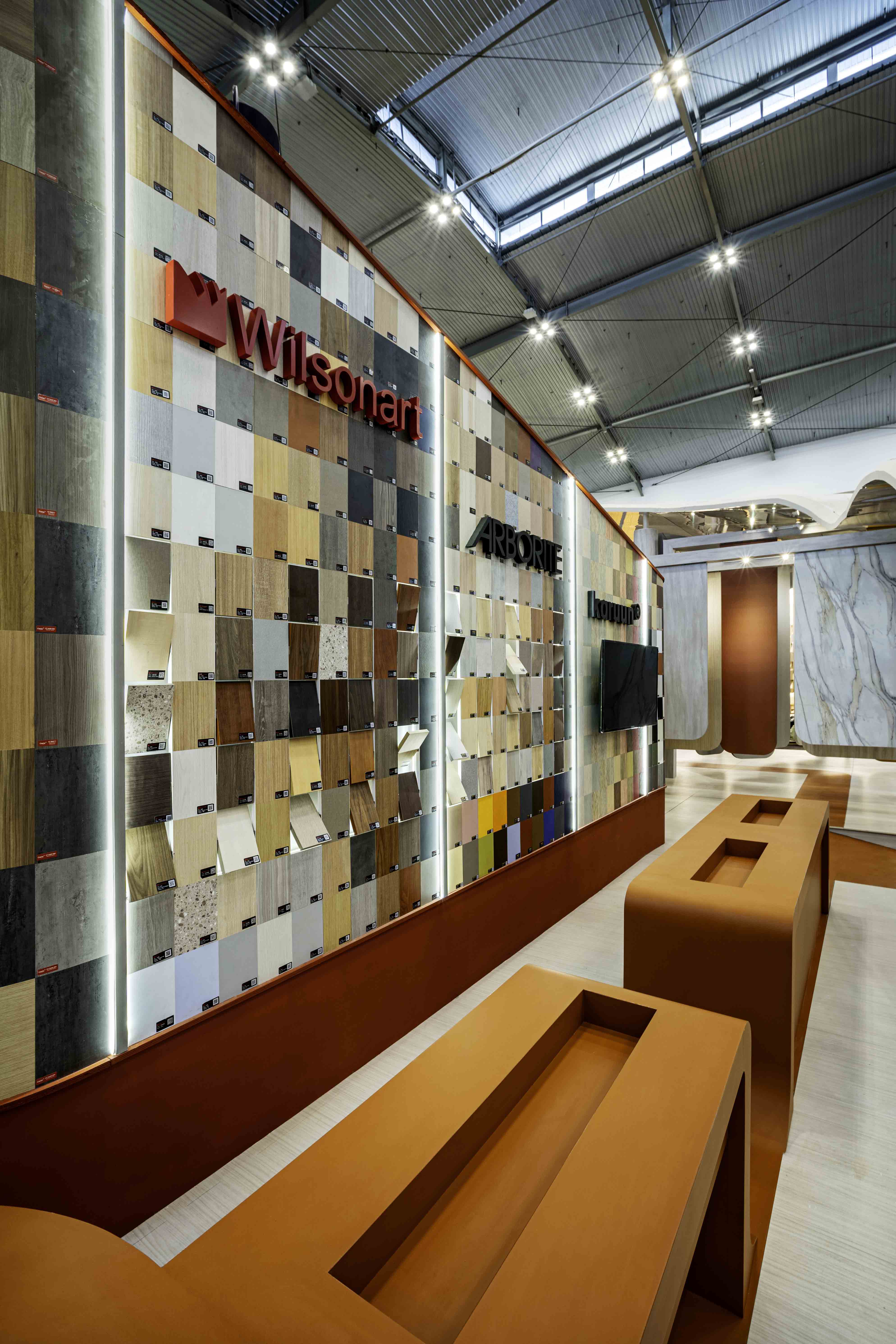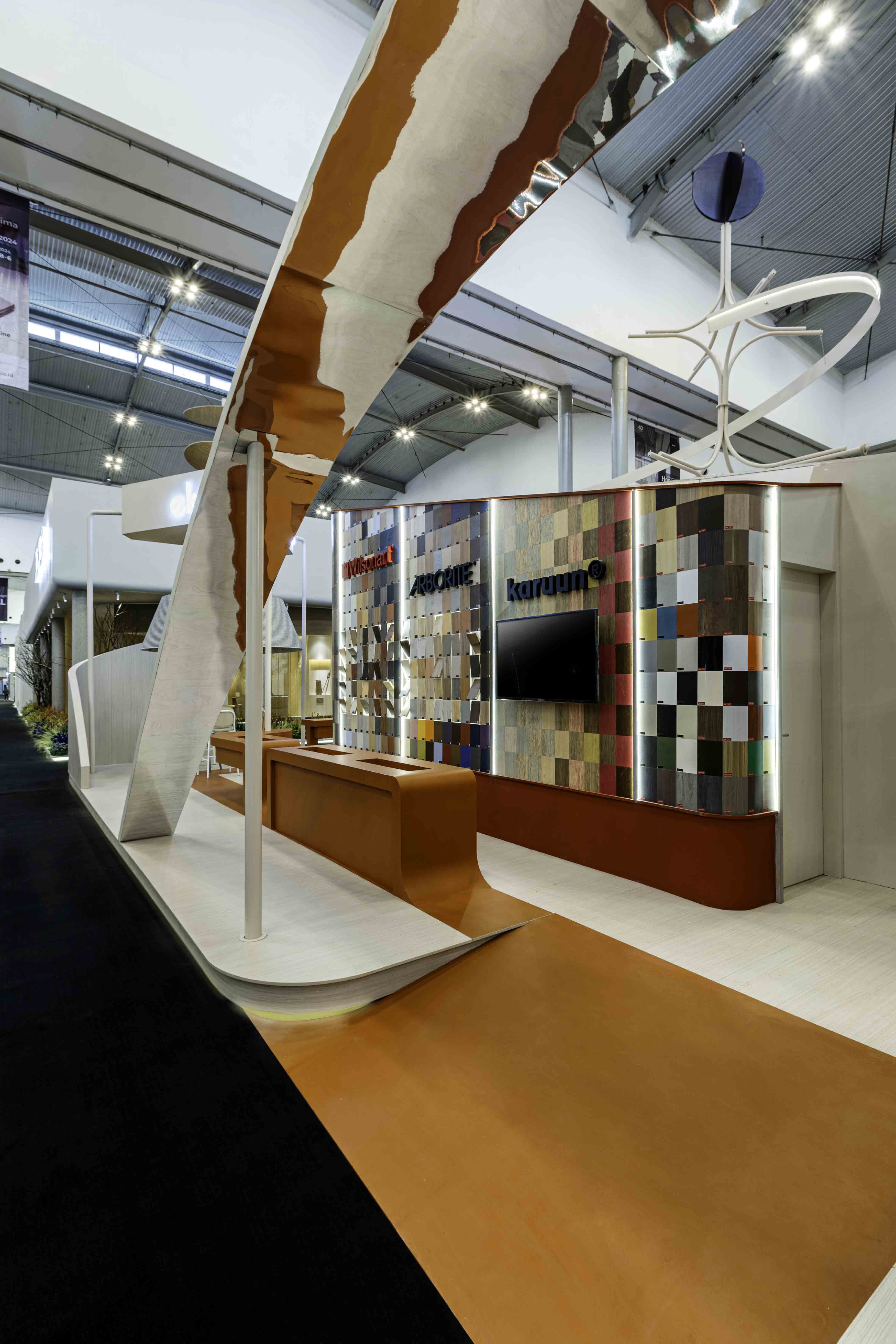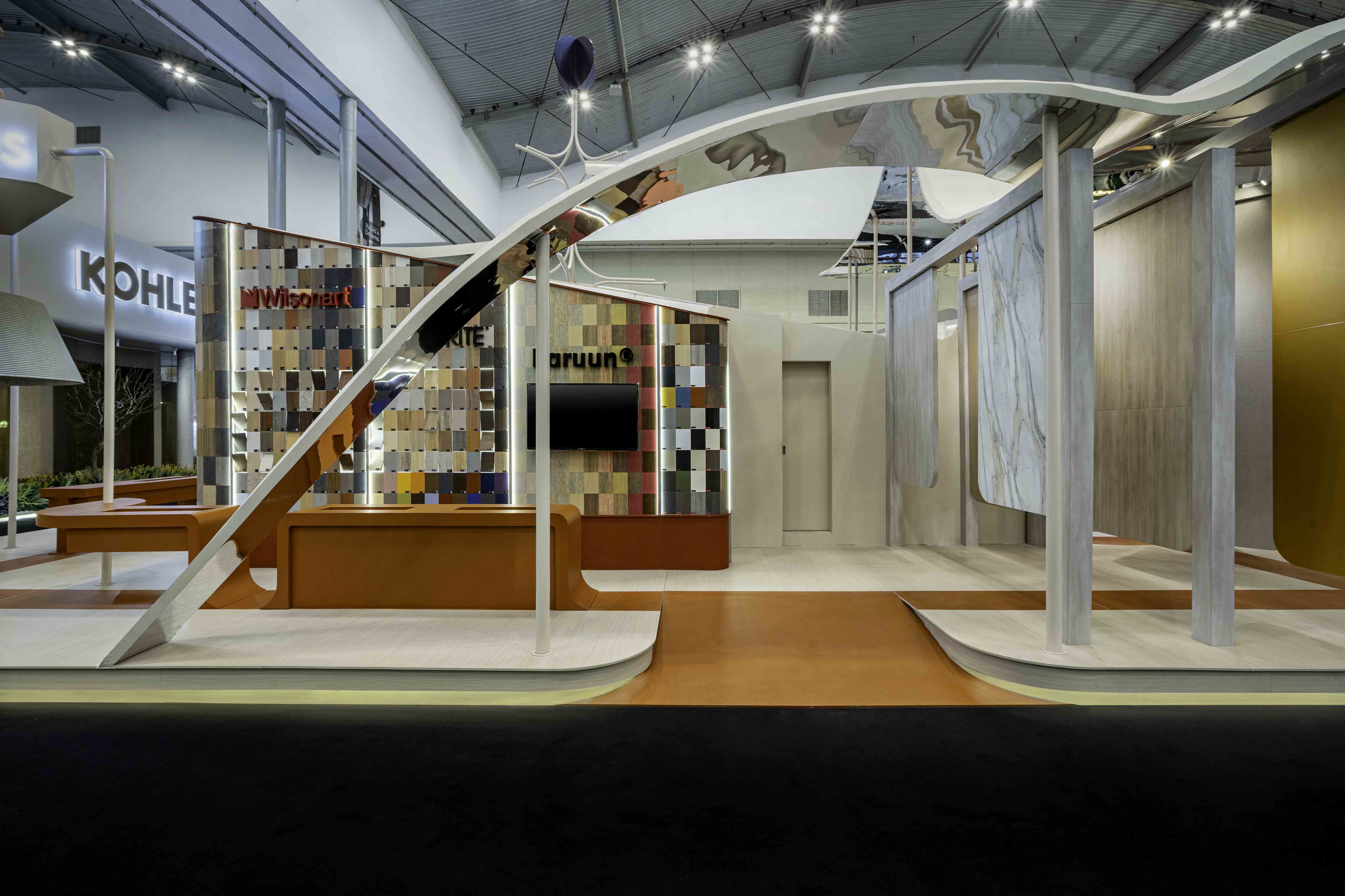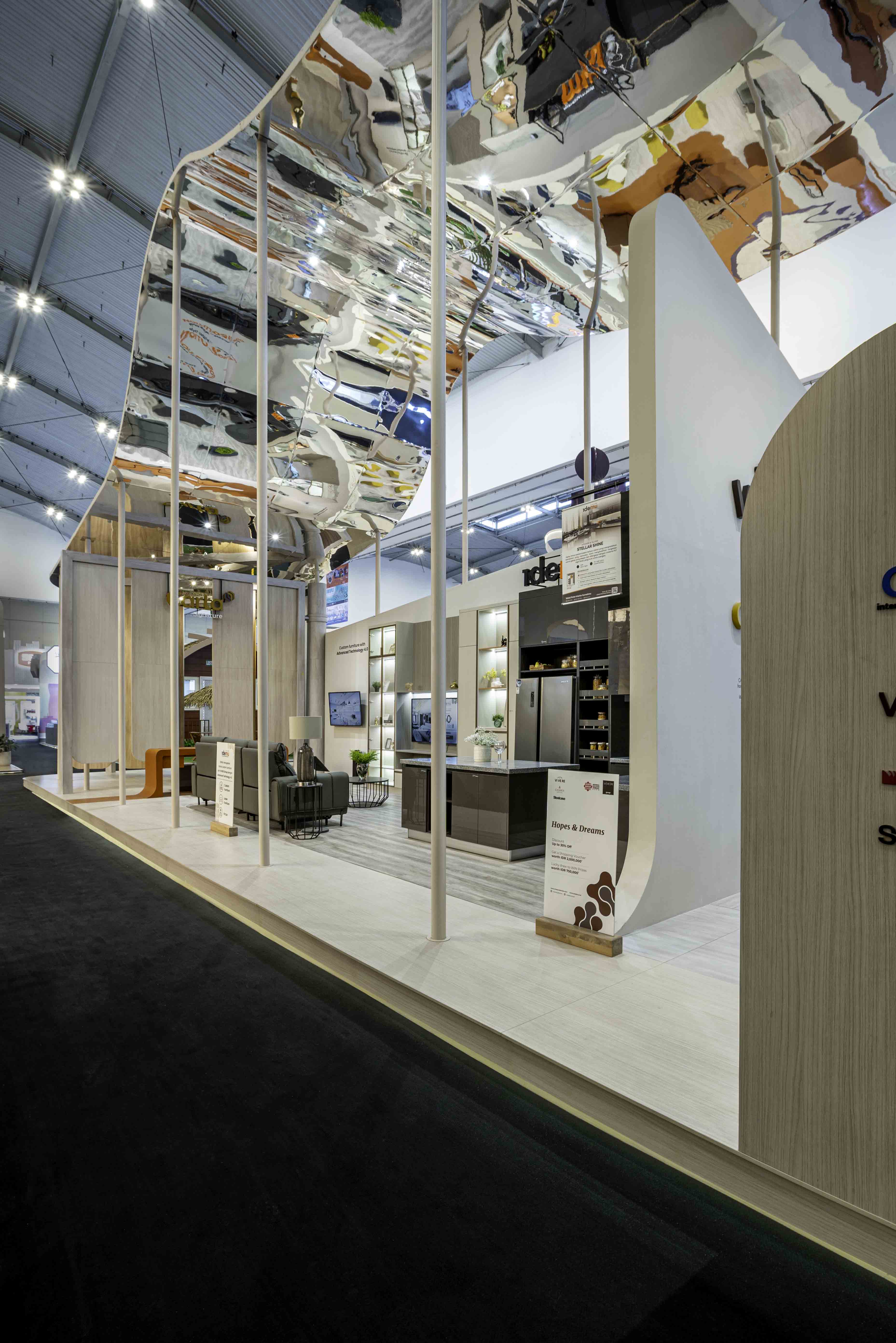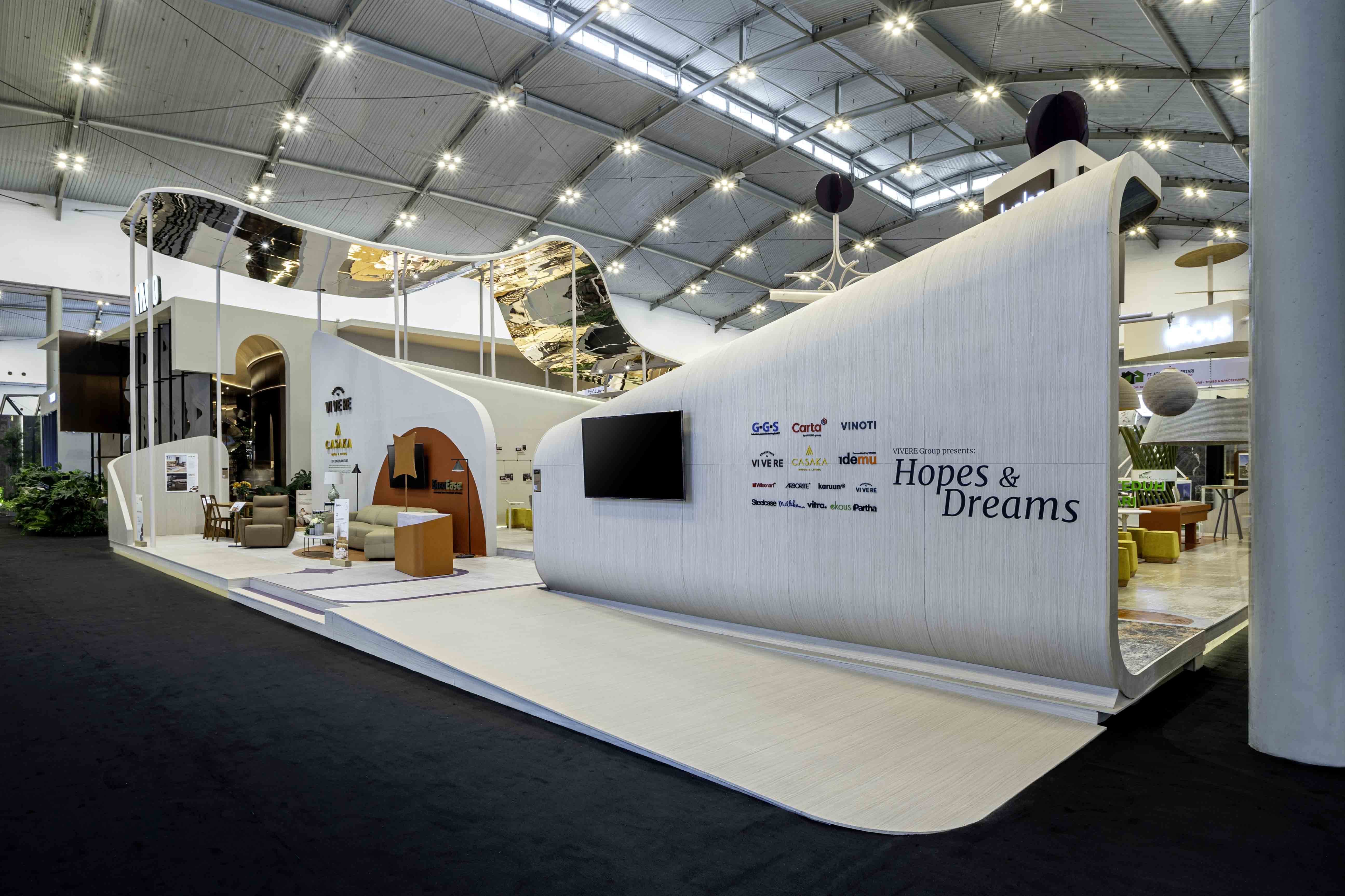 An exhibition booth that defies gravity, where angular walls and rounded shapes merge to form a landscape reminiscent of Martian terrain. The colors are ethereal, the textures otherworldly, yet every piece of furniture, from the plush sofas to the sleek office chairs, calling us to come closer, to touch, to experience.