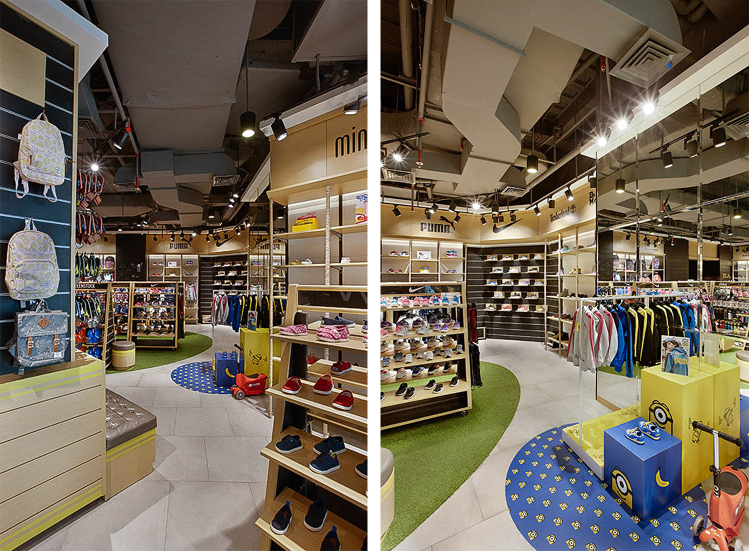 We arrange a dynamic layout that encourages children to move and run around. The interior feels like an outdoor playfield with wooden material, green carpet to represent the grass, and using sports games element: goal in the soccer game. the attractive graphic design also fills the retail space that blends in very well. To ensure flexibility of future merchandising changes, we device movable display rack to facilitate rearrangement.