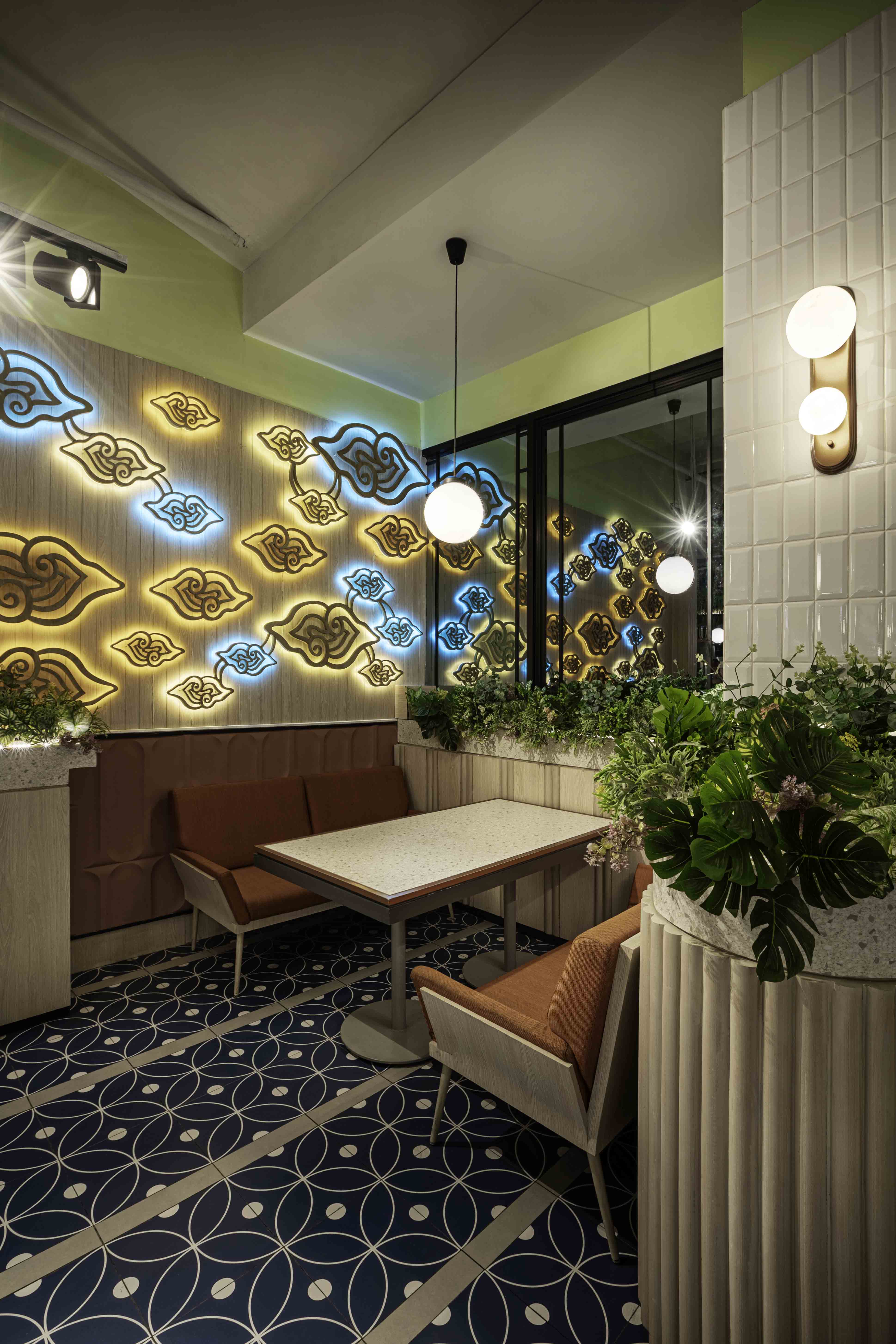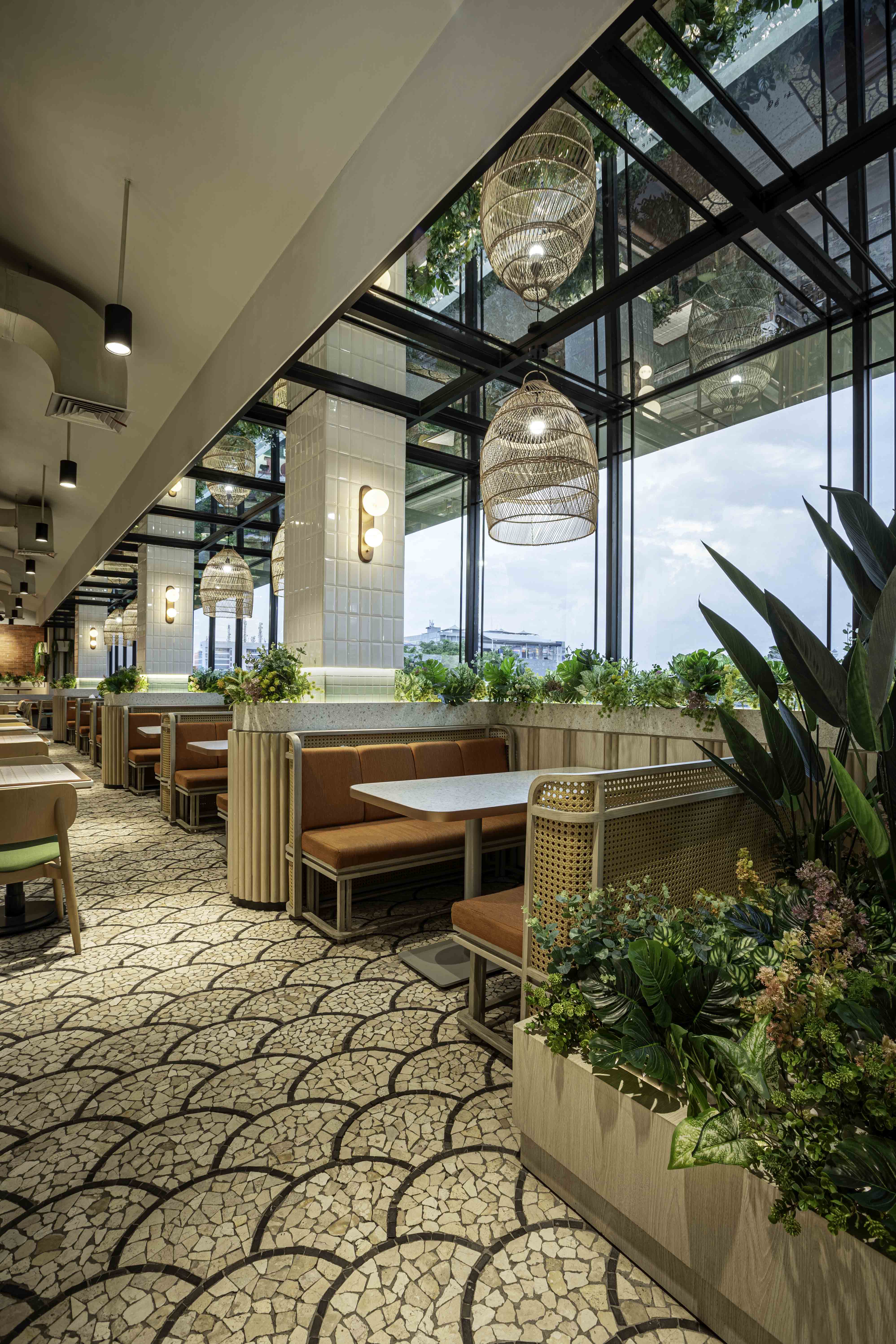 The space is thoughtfully designed with lush artificial plants and features a magnificent skylight, creating an inviting atmosphere. Our semi-outdoor dining area provides a perfect vantage point to enjoy the picturesque view of Gunung Tangkuban Perahu on clear days. This serene setting allows for a tranquil escape from the hustle and bustle of urban life, providing a perfect backdrop for any dining occasion.