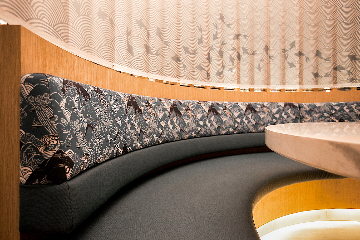 Dalam menunjang kenyamanan pelanggan, High Street Studio juga mengisolasi lorong utama restoran yang letaknya bersebelahan dengan Brewerkz. Material utama berupa kayu, laminated wood, texture paint, kaca, CNC cutting MDF, granite and marble stone, hingga printed fabric juga digunakan untuk menciptakan interior desain restoran terbaik bagi En Dining.
