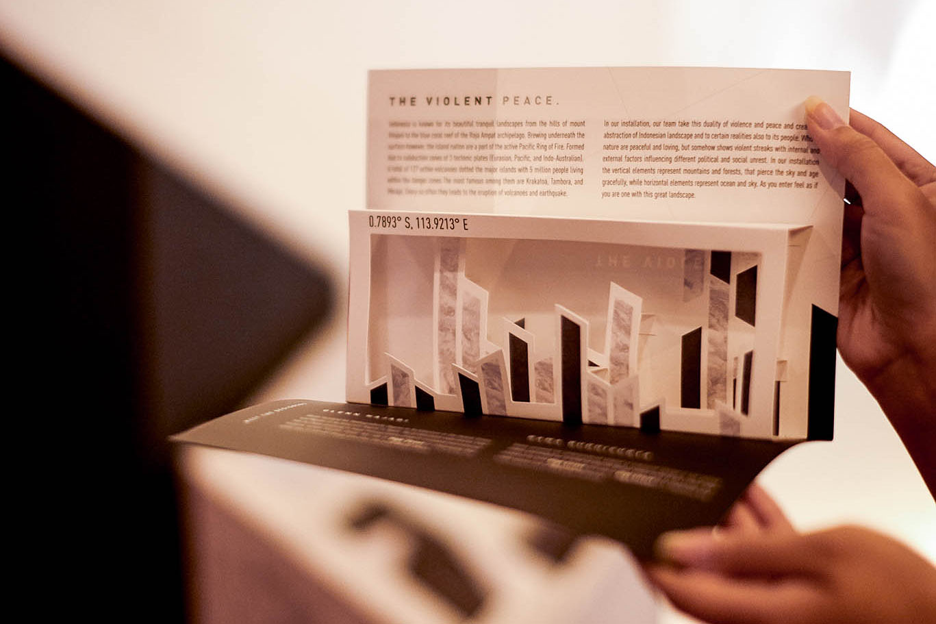 Installation The Violent Peace manifest the dualism of violence and peace that creates an abstraction of Indonesian landscape and a certain reality of its inhabitant. Considering that Indonesia has a peaceful and lovely side but also has rough lines from its internal and external factors that contributes in social and political instability. In this piece of art, vertical lines represent mountain and forest, gracefully emerging the sky and time, while horizontal lines represent ocean and sky. When visitors enter, they will instantly feel that they are becoming one with this landscape.